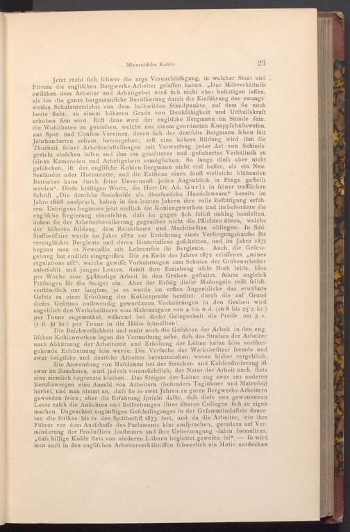 Die Anwendung von Mafchinen bei der Strecken- und Kohlenförderung ift zwar im Zunehmen, wird jedoch vorausfichtlich, der Natur der Arbeit nach, ftets eine ziemlich begrenzte bleiben. Das Steigen der Löhne zog zwar aus anderen Berufszweigen eine Anzahl von Arbeitern( befonders Taglöhner und Matrofen) herbei, und man nimmt an, dafs fie in zwei Jahren zu guten Bergwerks- Arbeitern geworden feien; aber die Erfahrung fpricht dafür, dafs diefe neu gewonnenen Leute rafch die Anfichten und Beftrebungen ihrer älteren Collegen fich zu eigen machen. Ungeachtet ungünftigen Gefchäftsganges in der Gefammtinduftrie dauerten die Strikes bis in den Spätherbft 1873 fort, und da die Arbeiter, wie ihre Führer vor dem Ausfchuffe des Parlaments klar ausfprachen, geradezu auf Verminderung der Production losfteuern und ihre Ueberzeugung dahin formuliren, ,, dafs billige Kohle ftets von niederen Löhnen begleitet gewefen fei"- fo wird man auch in den englifchen Arbeiterverhältniffen fchwerlich ein Motiv entdecken