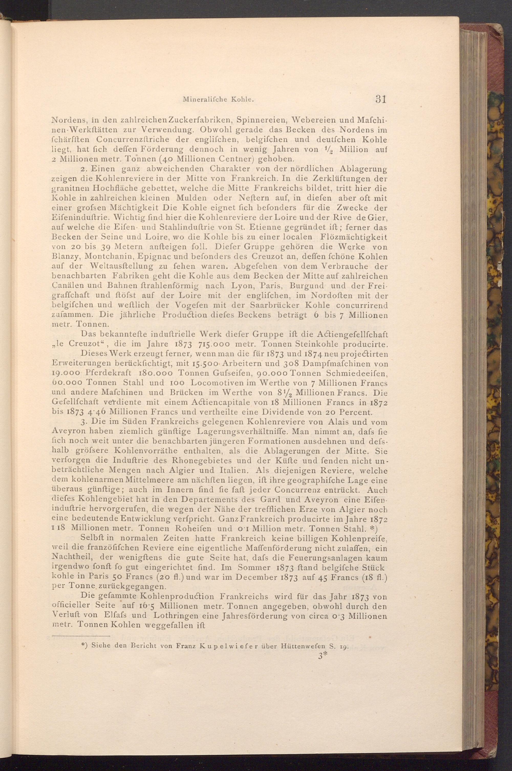Die gefammte Kohlenproduction Frankreichs wird für das Jahr 1873 von officieller Seite auf 16.5 Millionen metr. Tonnen angegeben, obwohl durch den Verluft von Elfafs und Lothringen eine Jahresförderung von circa o 3 Millionen metr. Tonnen Kohlen weggefallen ift