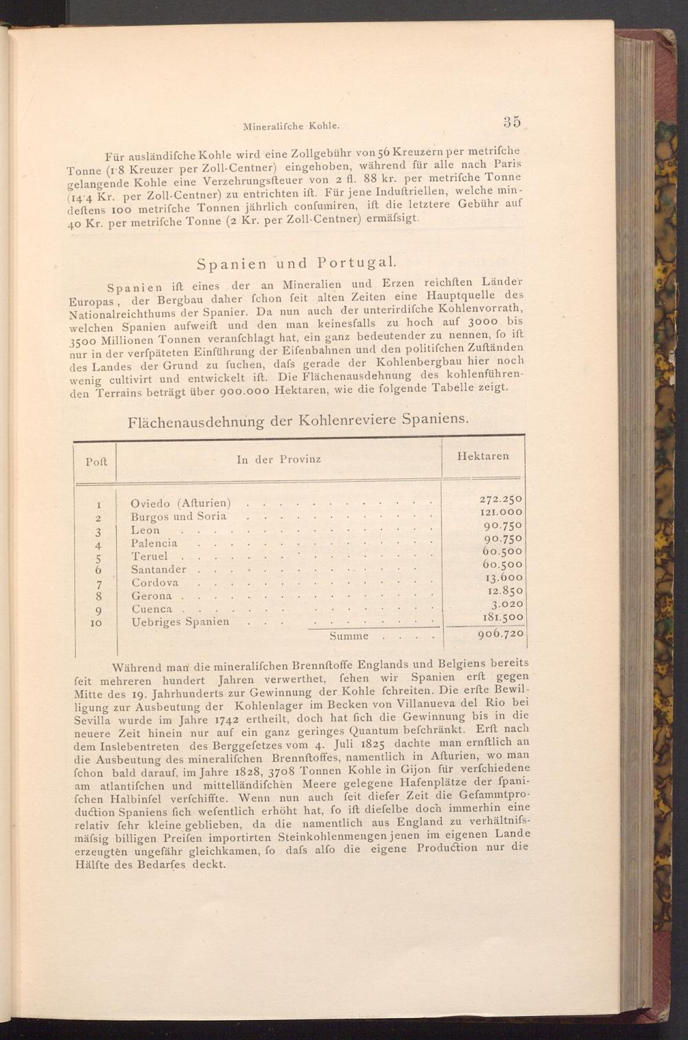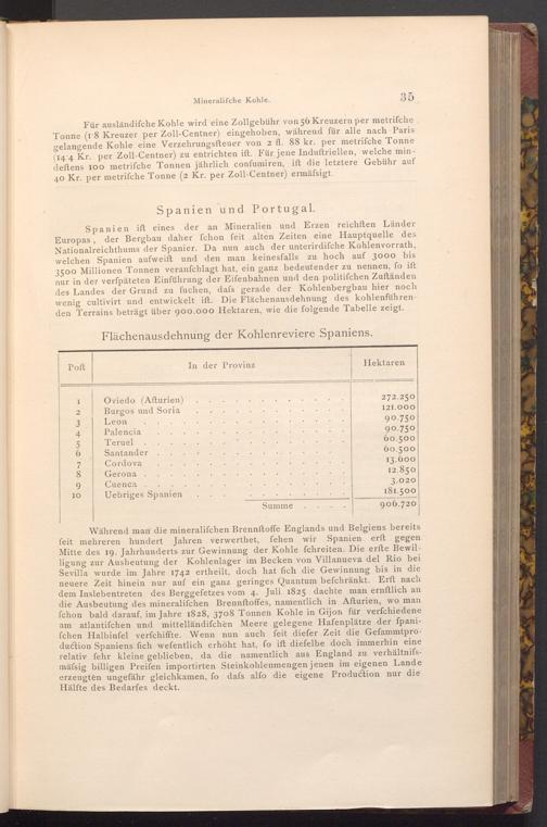 Spanien ift eines der an Mineralien und Erzen reichften Länder Europas, der Bergbau daher fchon feit alten Zeiten eine Hauptquelle des Nationalreichthums der Spanier. Da nun auch der unterirdifche Kohlenvorrath, welchen Spanien aufweift und den man keinesfalls zu hoch auf 3000 bis 3500 Millionen Tonnen veranfchlagt hat, ein ganz bedeutender zu nennen, fo ift nur in der verfpäteten Einführung der Eifenbahnen und den politifchen Zuftänden des Landes der Grund zu fuchen, dafs gerade der Kohlenbergbau hier noch wenig cultivirt und entwickelt ift. Die Flächenausdehnung des kohlenführenden Terrains beträgt über 900.000 Hektaren, wie die folgende Tabelle zeigt.