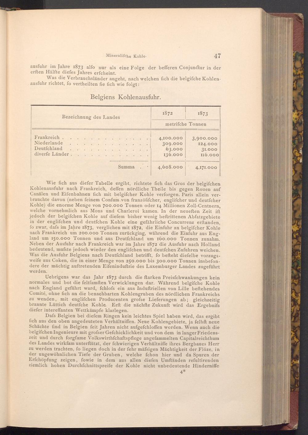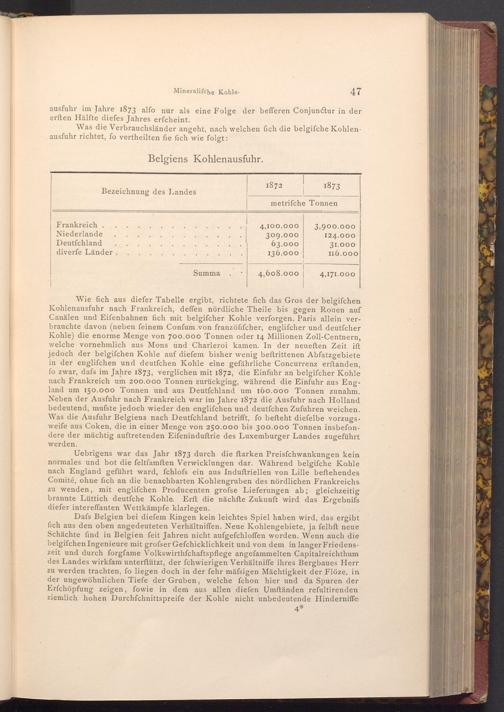 Uebrigens war das Jahr 1873 durch die ftarken Preisfchwankungen kein normales und bot die feltfamften Verwicklungen dar. Während belgifche Kohle nach England geführt ward, fchlofs ein aus Induftriellen von Lille beftehendes Comité, ohne fich an die benachbarten Kohlengruben des nördlichen Frankreichs zu wenden, mit englifchen Producenten grofse Lieferungen ab; gleichzeitig brannte Lüttich deutfche Kohle. Erft die nächfte Zukunft wird das Ergebnifs diefer intereffanten Wettkämpfe klarlegen.