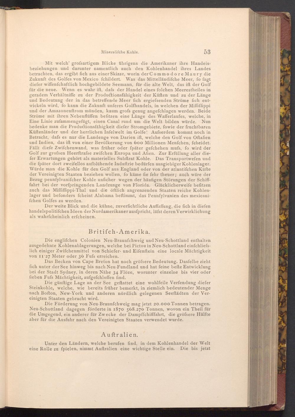 Die englifchen Colonien Neu- Braunfchweig und Neu- Schottland enthalten ausgedehnte Kohlenablagerungen, welche bei Pictou in Neu- Schottland einfchliefslich einiger Zwifchenmittel von Schiefer- und Eifenftein eine locale Mächtigkeit von II 27 Meter oder 36 Fufs erreichen.