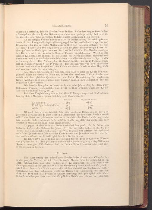 Die Ausbeutung der chinefifchen Kohlenfelder führen die Chinefen bis in die grauefte Vorzeit zurück. Der Reifende Marco Polo berichtete fchon im XIII. Jahrhunderte von den bedeutenden Kohlenlagern in den weftlichen Gebirgen, doch ift die Art und Weife der Gewinnung heute noch ebenfo primitiv wie früher. Zum erften Male wurden die reichen chinefifchen Kohlenlager näher unterfucht von dem bekannten Geologen Baron von Richthofen, welcher von 1868 bis 1872 faft alle Provinzen Chinas durchzog und geologifch erforfchte Seine Mittheilungen über den unerfchöpflichen Reichthum Chinas an Eifen und