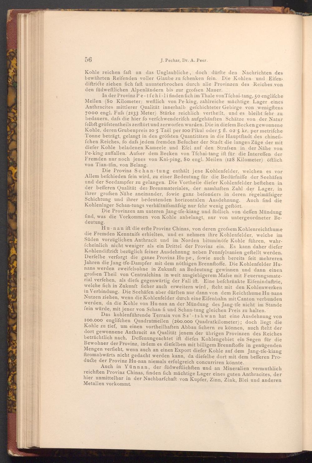 Kohle reichen faft an das Unglaubliche, doch dürfte den Nachrichten des bewährten Reifenden voller Glaube zu fchenken fein. Die Kohlen und Eifendiftricte ziehen fich faft ununterbrochen durch alle Provinzen des Reiches von den füdweftlichen Alpenländern bis zur grofsen Mauer.