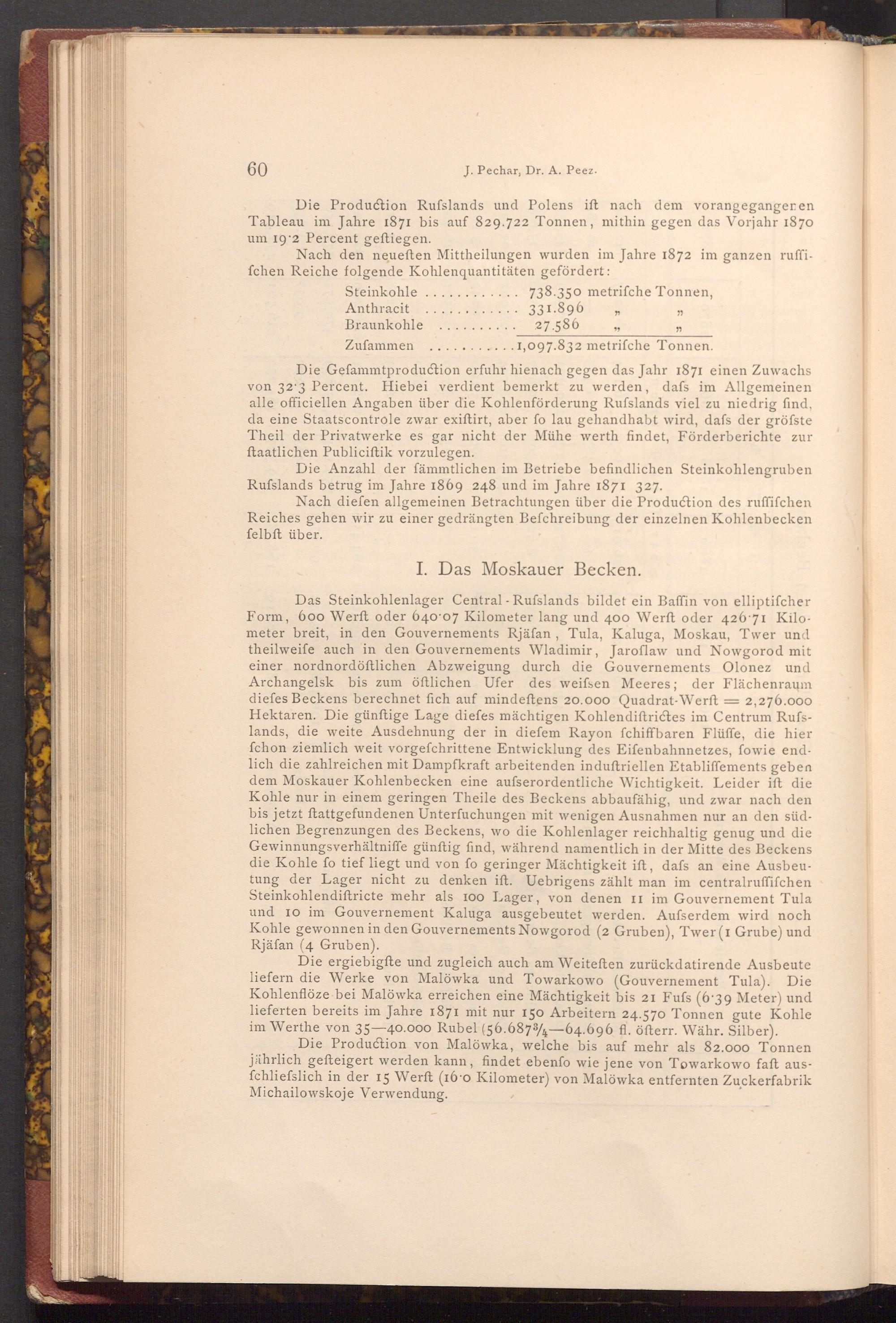 Die ergiebigfte und zugleich auch am Weiteften zurückdatirende Ausbeute liefern die Werke von Malöwka und Towarkowo( Gouvernement Tula). Die Kohlenflöze bei Malöwka erreichen eine Mächtigkeit bis 21 Fufs( 6.39 Meter) und lieferten bereits im Jahre 1871 mit nur 150 Arbeitern 24.570 Tonnen gute Kohle im Werthe von 35-40.000 Rubel( 56.68734-64.696 fl. öfterr. Währ. Silber).