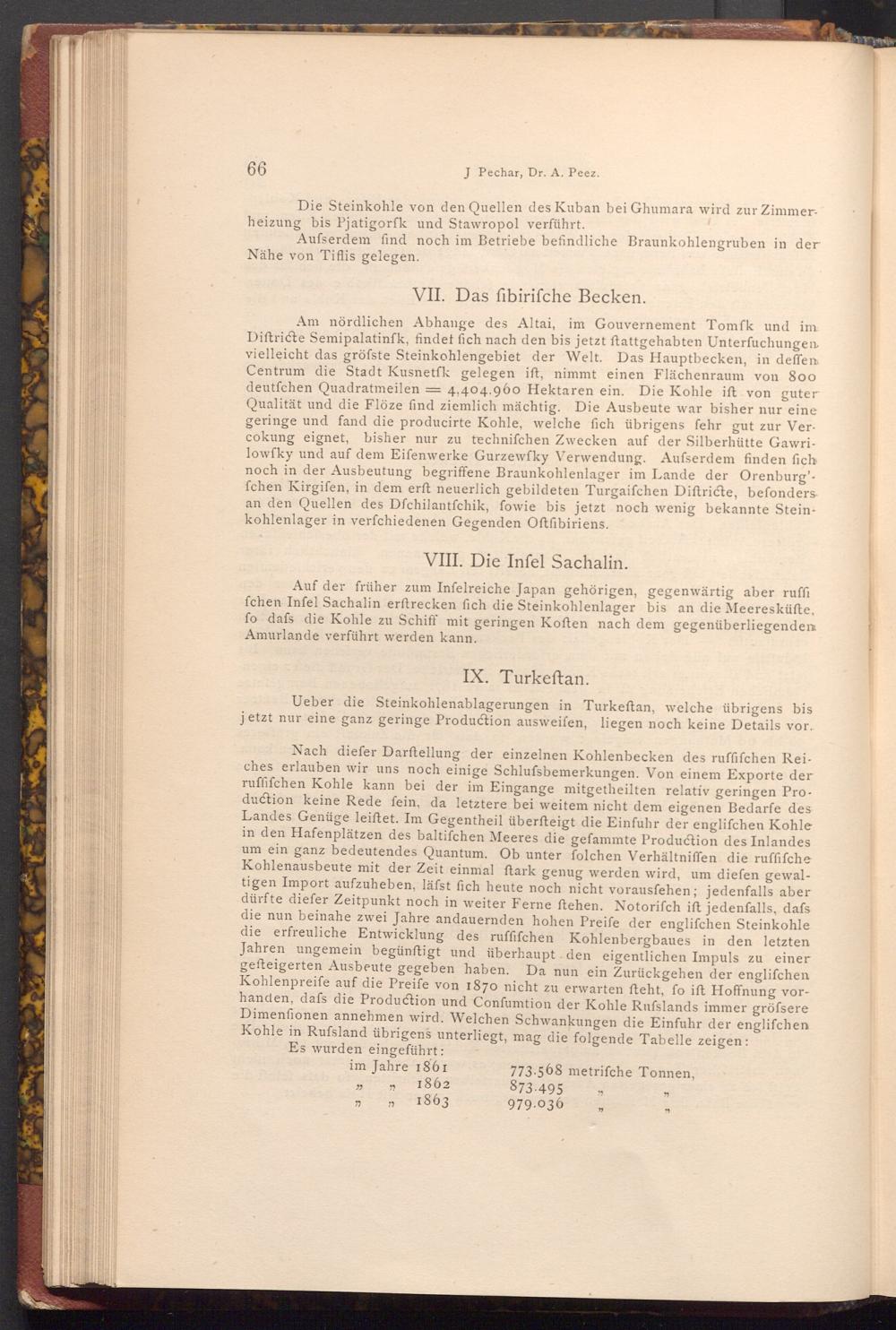 Am nördlichen Abhange des Altai, im Gouvernement Tomfk und im Diftricte Semipalatinfk, findet fich nach den bis jetzt ftattgehabten Unterfuchungen vielleicht das gröfste Steinkohlengebiet der Welt. Das Hauptbecken, in deffen Centrum die Stadt Kusnetfk gelegen ift, nimmt einen Flächenraum von 800 deutfchen Quadratmeilen= 4,404.960 Hektaren ein. Die Kohle ift von guter Qualität und die Flöze find ziemlich mächtig. Die Ausbeute war bisher nur eine geringe und fand die producirte Kohle, welche fich übrigens fehr gut zur Vercokung eignet, bisher nur zu techniſchen Zwecken auf der Silberhütte Gawrilowfky und auf dem Eifenwerke Gurzewfky Verwendung. Aufserdem finden fich noch in der Ausbeutung begriffene Braunkohlenlager im Lande der Orenburg'fchen Kirgifen, in dem erft neuerlich gebildeten Turgaifchen Diftricte, befonders an den Quellen des Dfchilantfchik, fowie bis jetzt noch wenig bekannte Steinkohlenlager in verfchiedenen Gegenden Oftfibiriens.