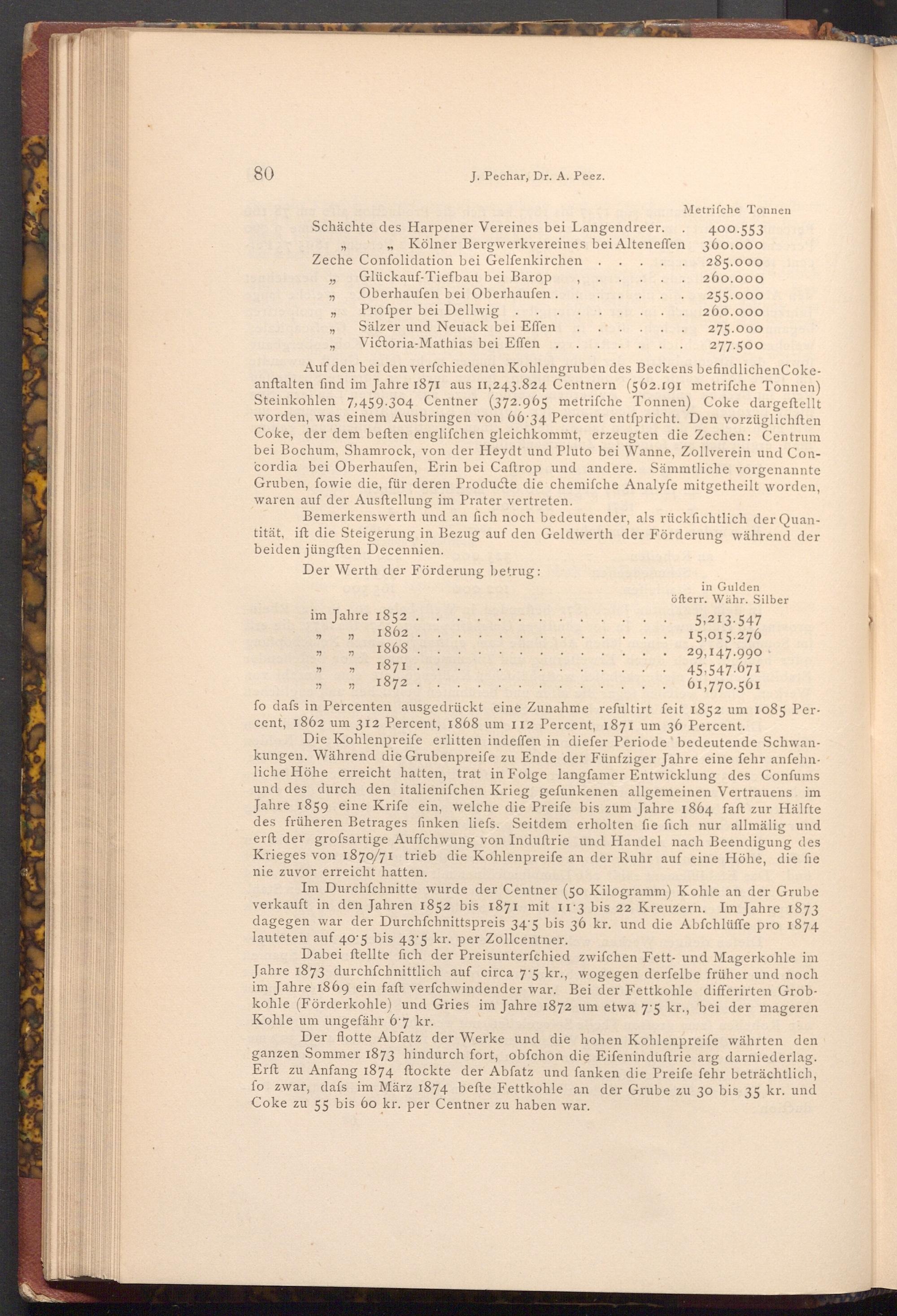 Im Durchschnitte wurde der Centner( 50 Kilogramm) Kohle an der Grube verkauft in den Jahren 1852 bis 1871 mit 11 3 bis 22 Kreuzern. Im Jahre 1873 dagegen war der Durchfchnittspreis 34'5 bis 36 kr. und die Abfchlüffe pro 1874 lauteten auf 40 5 bis 43'5 kr. per Zollcentner.