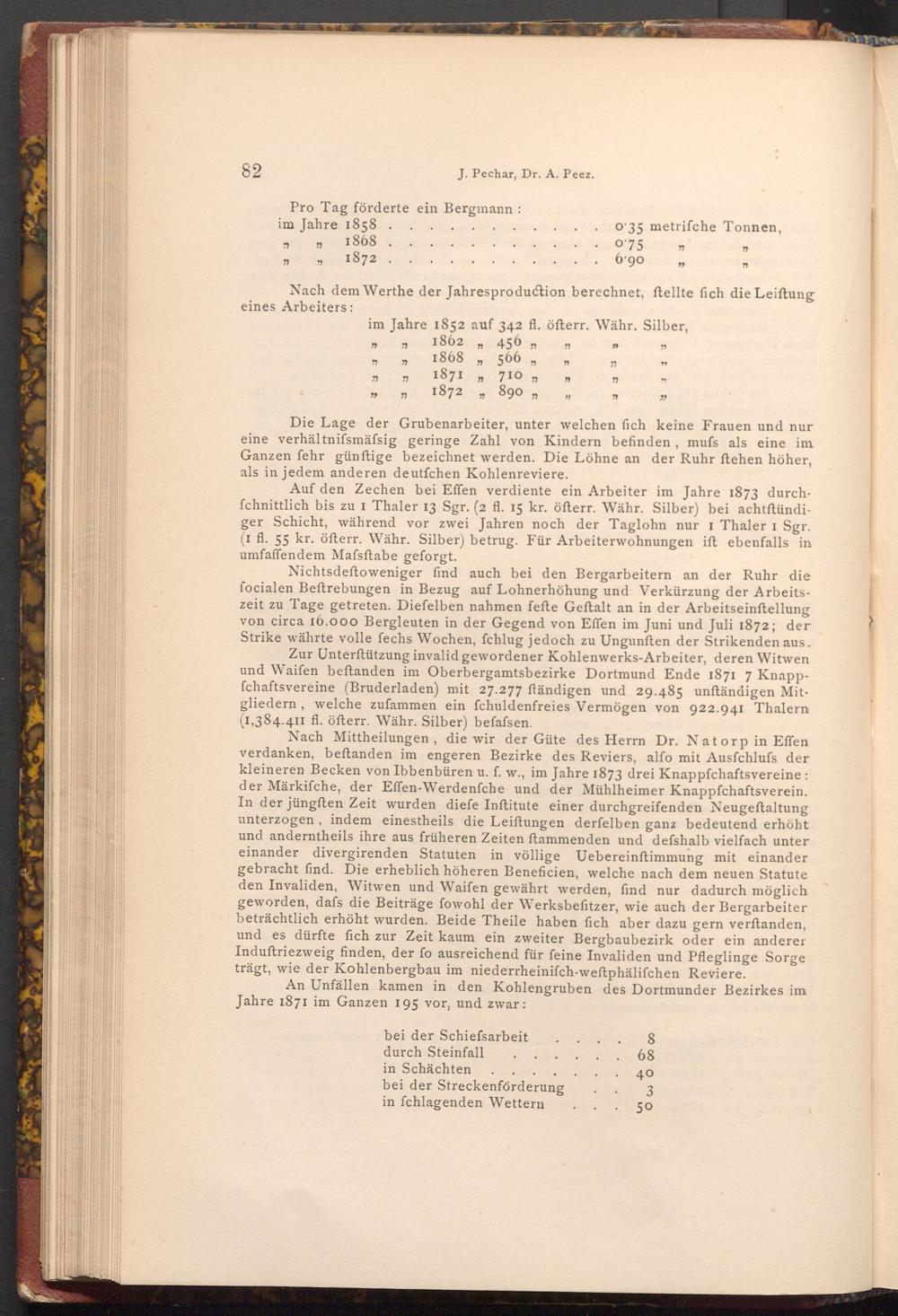 Zur Unterſtützung invalid gewordener Kohlenwerks- Arbeiter, deren Witwen und Waifen beftanden im Oberbergamtsbezirke Dortmund Ende 1871 7 Knappfchaftsvereine( Bruderladen) mit 27.277 ftändigen und 29.485 unftändigen Mitgliedern, welche zufammen ein fchuldenfreies Vermögen von 922.941 Thalern ( 1,384.411 fl. öfterr. Währ. Silber) befafsen.