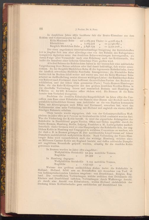 Alle drei Bahnen des Ruhrbeckens haben in der letzten Zeit eine anfehnliche Vergröfserung ihres Netzes erfahren oder find damit befchäftigt, fich weiter auszudehnen. Zu der Bergifch- Märkifchen Bahn ift die fogenannte Ruhrthalbahn, fowie die käuflich erworbene Heffifche Nordbahn hinzugetreten; die Rheinifche Bahn breitet fich im Becken felbft weiter und weiter aus, und die Köln Mindener Bahn arbeitet an der Herftellung zweier überaus wichtigen Linien: der Emfcherthal- Bahn von Ruhrort nach Dortmund, dazu beftimmt, die nördlichen Partien des Beckens zu erfchliefsen, und der fchon oben genannten( Paris-) Venlo- Bremen- Hamburger Bahn, die das Ruhr- Kohlengebiet mit den grofsen deutfchen Nordfee- Häfen in die directefte Verbindung fetzen und namentlich Bremen und Hamburg um 8 Meilen= 60 687 Kilometer näher rücken wird. Bis Bremen ift die Bahn bereits dem Verkehre übergeben.