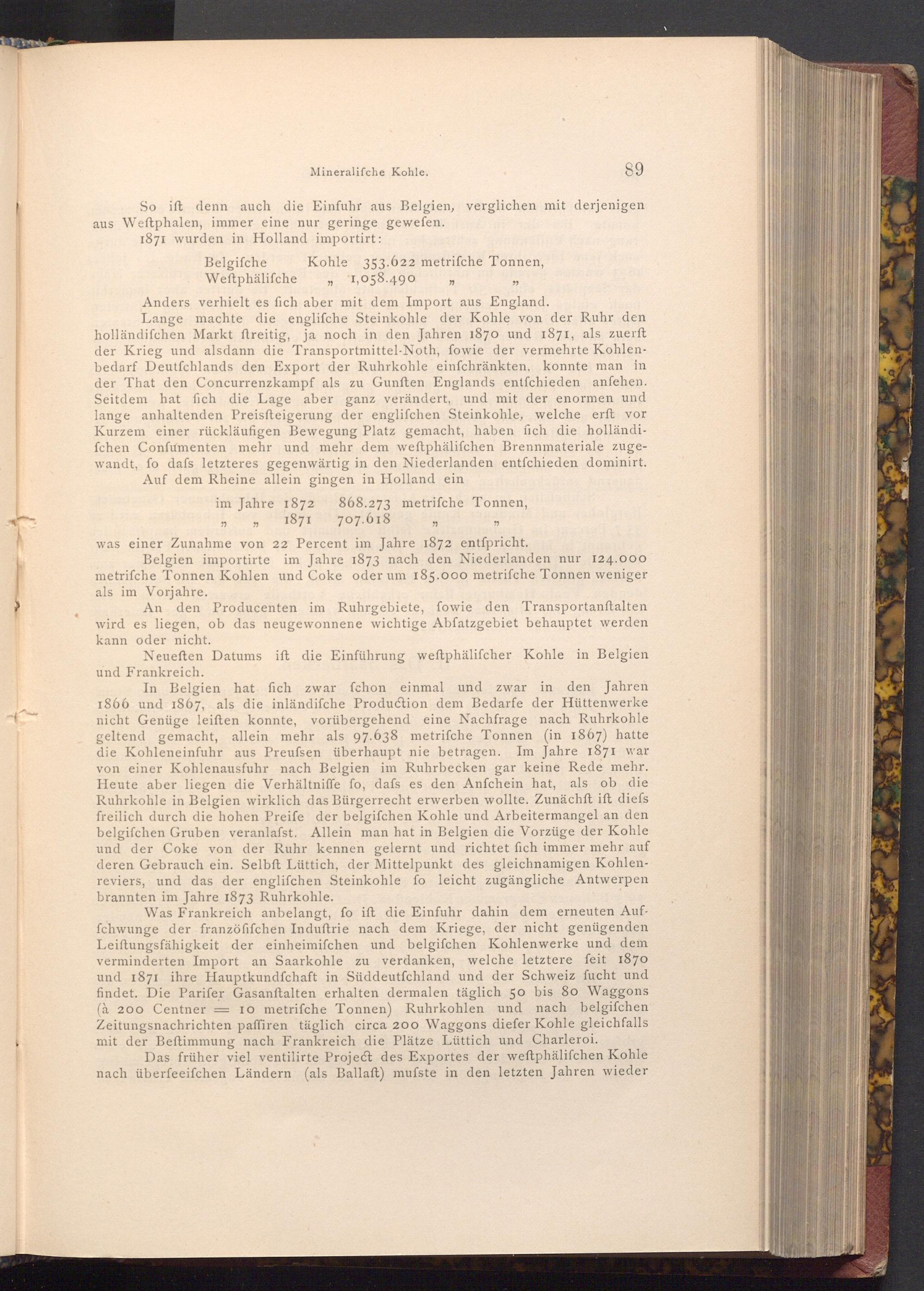 In Belgien hat fich zwar fchon einmal und zwar fchon einmal und zwar in den Jahren 1866 und 1867, als die inländifche Production dem Bedarfe der Hüttenwerke nicht Genüge leiften konnte, vorübergehend eine Nachfrage nach Ruhrkohle geltend gemacht, allein mehr als 97.638 metrifche Tonnen( in 1867) hatte die Kohleneinfuhr aus Preufsen überhaupt nie betragen. Im Jahre 1871 war von einer Kohlenausfuhr nach Belgien im Ruhrbecken gar keine Rede mehr. Heute aber liegen die Verhältniffe fo, dafs es den Anfchein hat, als ob die Ruhrkohle in Belgien wirklich das Bürgerrecht erwerben wollte. Zunächft ift diefs freilich durch die hohen Preife der belgifchen Kohle und Arbeitermangel an den belgifchen Gruben veranlafst. Allein man hat in Belgien die Vorzüge der Kohle und der Coke von der Ruhr kennen gelernt und richtet fich immer mehr auf deren Gebrauch ein. Selbft Lüttich, der Mittelpunkt des gleichnamigen Kohlenreviers, und das der englifchen Steinkohle fo leicht zugängliche Antwerpen brannten im Jahre 1873 Ruhrkohle.