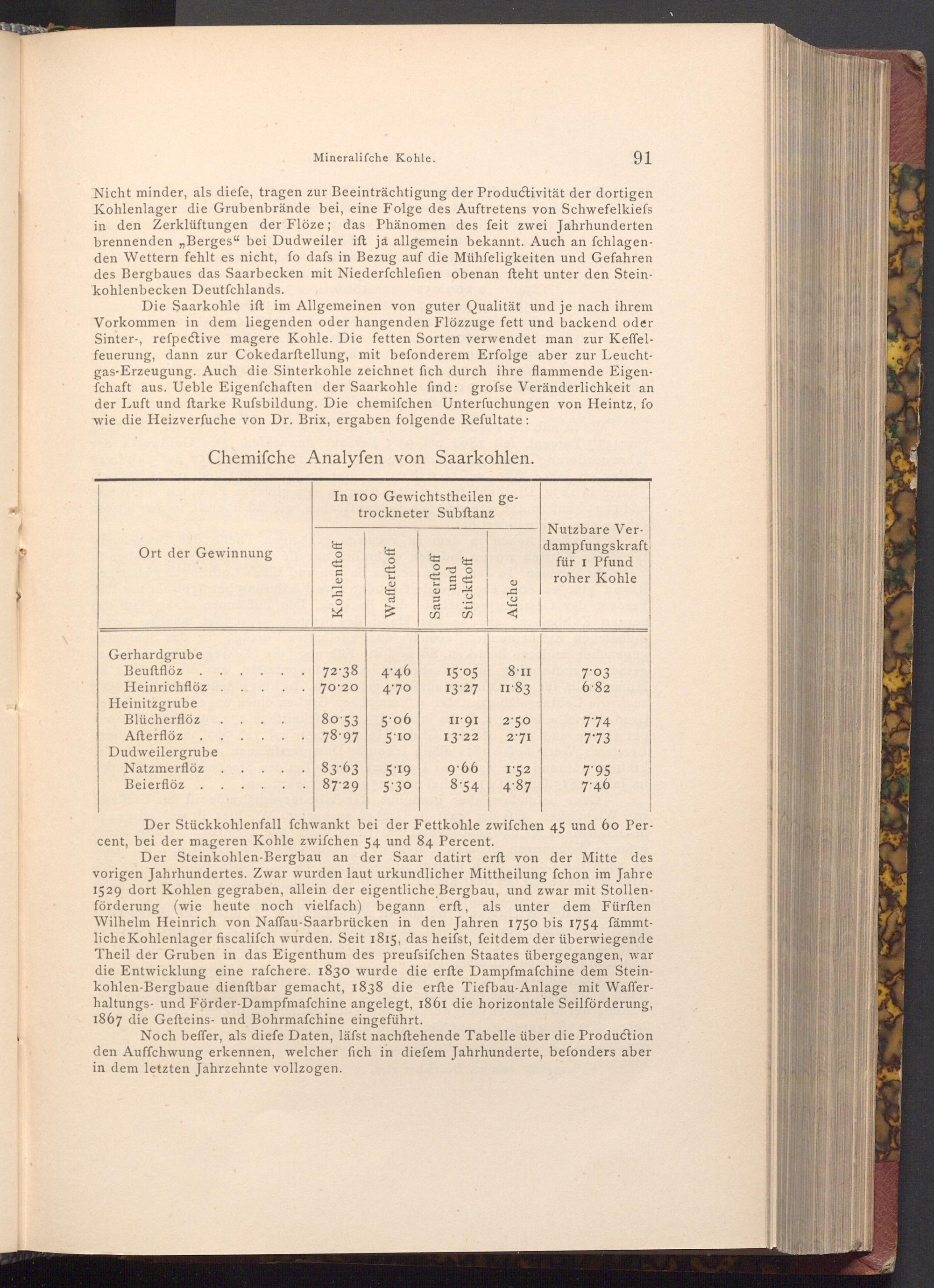 Die Saarkohle ift im Allgemeinen von guter Qualität und je nach ihrem Vorkommen in dem liegenden oder hangenden Flözzuge fett und backend oder Sinter-, refpective magere Kohle. Die fetten Sorten verwendet man zur Keffelfeuerung, dann zur Cokedarftellung, mit befonderem Erfolge aber zur Leuchtgas- Erzeugung. Auch die Sinterkohle zeichnet fich durch ihre flammende Eigenfchaft aus. Ueble Eigenfchaften der Saarkohle find: grofse Veränderlichkeit an der Luft und ſtarke Rufsbildung. Die chemifchen Unterfuchungen von Heintz, fo wie die Heizverfuche von Dr. Brix, ergaben folgende Refultate: