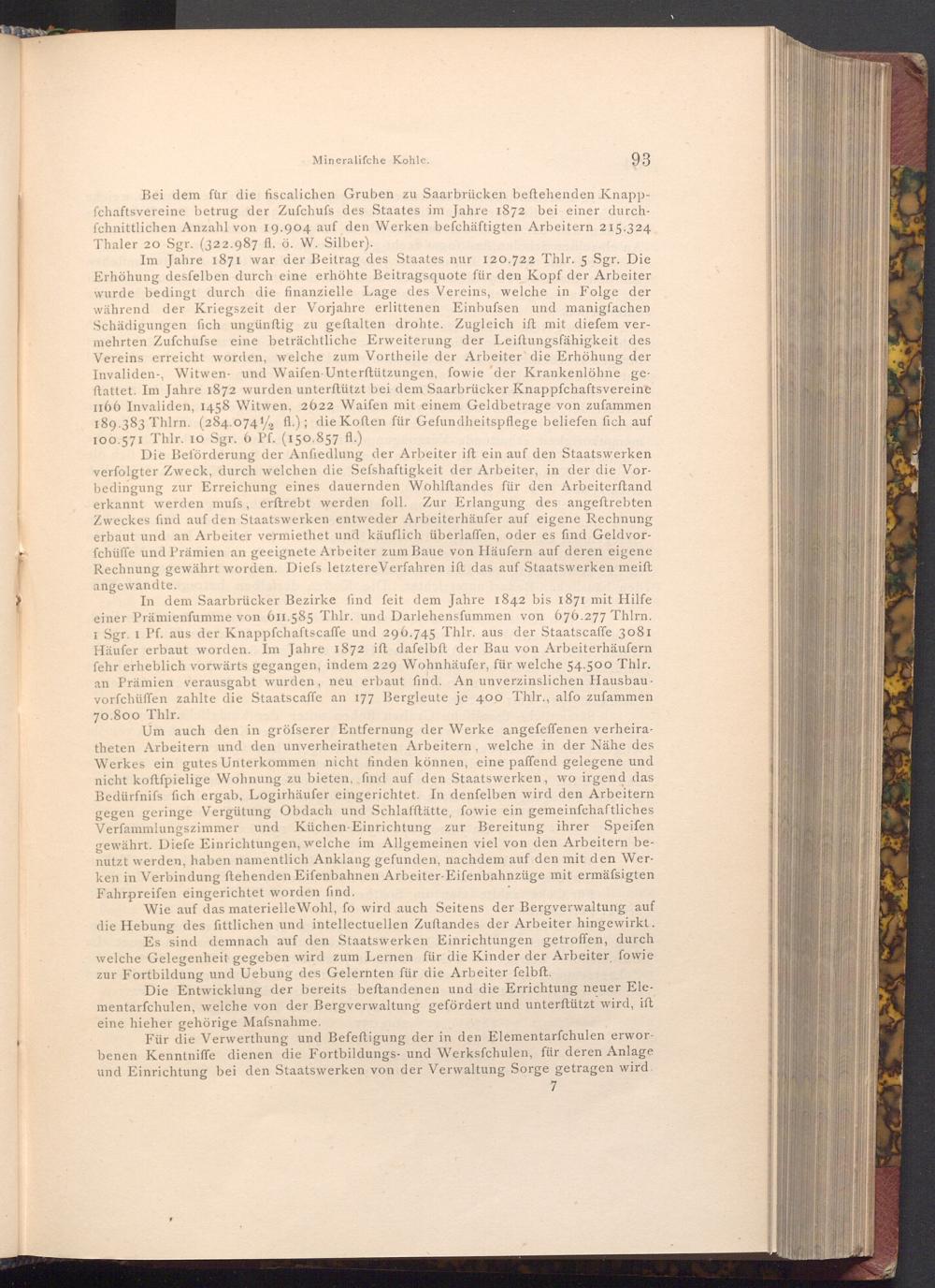 Bei dem für die fiscalichen Gruben zu Saarbrücken beftehenden Knappfchaftsvereine betrug der Zufchufs des Staates im Jahre 1872 bei einer durchfchnittlichen Anzahl von 19.904 auf den Werken befchäftigten Arbeitern 215.324 Thaler 20 Sgr.( 322.987 fl. ö. W. Silber).