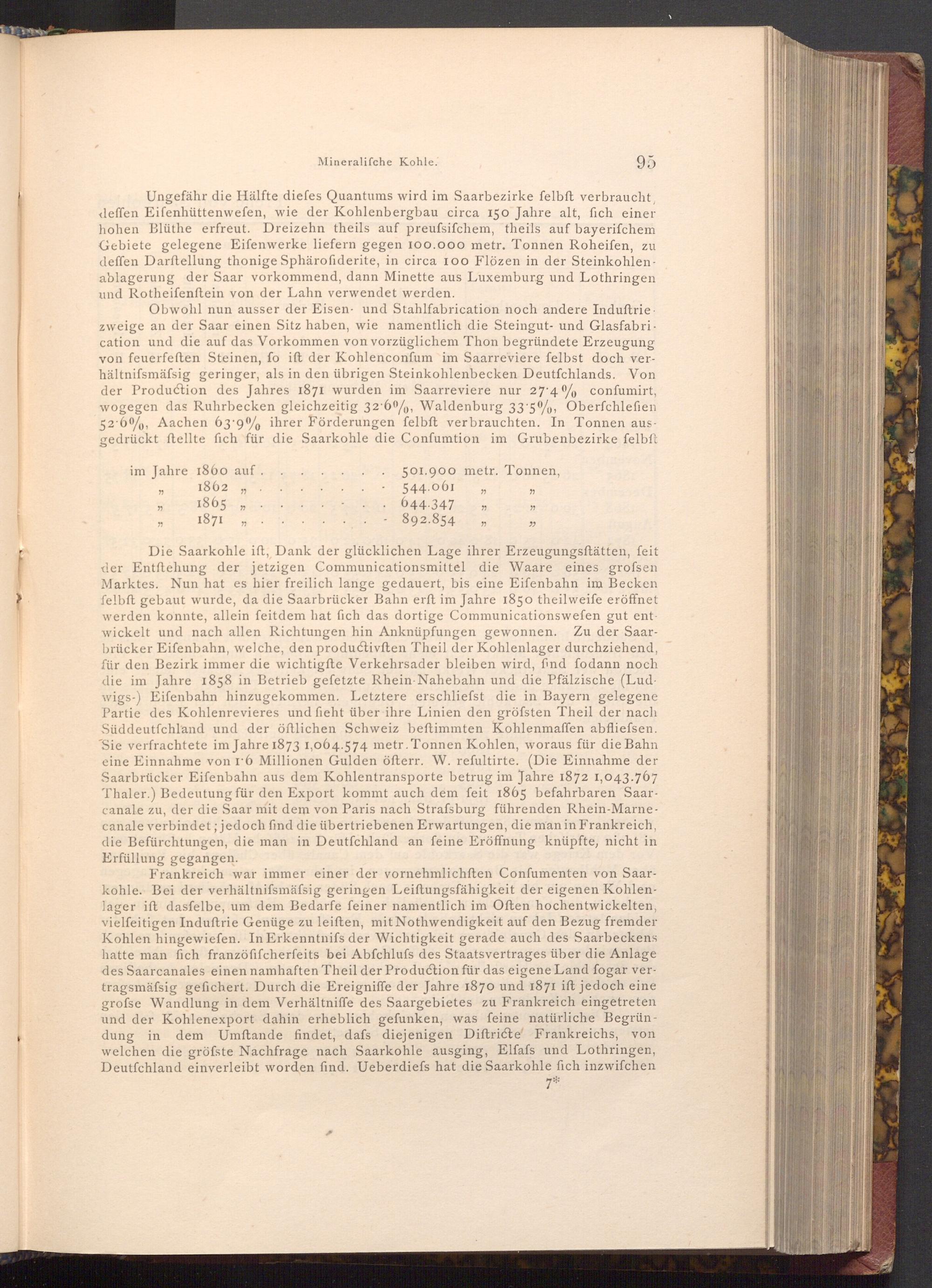 Die Saarkohle ift, Dank der glücklichen Lage ihrer Erzeugungsftätten, feit der Entstehung der jetzigen Communicationsmittel die Waare eines grofsen Marktes. Nun hat es hier freilich lange gedauert, bis eine Eifenbahn im Becken felbft gebaut wurde, da die Saarbrücker Bahn erft im Jahre 1850 theilweife eröffnet werden konnte, allein feitdem hat fich das dortige Communicationswefen gut entwickelt und nach allen Richtungen hin Anknüpfungen gewonnen. Zu der Saarbrücker Eifenbahn, welche, den productivften Theil der Kohlenlager durchziehend, für den Bezirk immer die wichtigfte Verkehrsader bleiben wird, find fodann noch die im Jahre 1858 in Betrieb gefetzte Rhein- Nahebahn und die Pfälzische( Lud. wigs-) Eifenbahn hinzugekommen. Letztere erschliefst die in Bayern gelegene Partie des Kohlenrevieres und fieht über ihre Linien den gröfsten Theil der nach Süddeutſchland und der öftlichen Schweiz beftimmten Kohlenmaffen abfliefsen. Sie verfrachtete im Jahre 1873 1,064.574 metr. Tonnen Kohlen, woraus für die Bahn eine Einnahme von 16 Millionen Gulden öfterr. W. refultirte.( Die Einnahme der Saarbrücker Eifenbahn aus dem Kohlentransporte betrug im Jahre 1872 1,043.767 Thaler.) Bedeutung für den Export kommt auch dem feit 1865 befahrbaren Saarcanale zu, der die Saar mit dem von Paris nach Strafsburg führenden Rhein- Marnecanale verbindet; jedoch find die übertriebenen Erwartungen, die man in Frankreich, die Befürchtungen, die man in Deutſchland an feine Eröffnung knüpfte, nicht in Erfüllung gegangen.