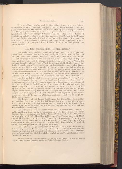 Das Vorkommen von Brauneifenfteinen und Thoneifenfteinen, zwar nicht im Steinkohlengebiete, aber in der angrenzenden Tertiärformation gab in Verbindung mit dem Kohlenreichthume des Landes Anlafs zu einer Eifeninduftrie, welche im Jahre 1871 in 38 Coke Hochöfen 218.881 metrifche Tonnen und in 17 Hochöfen mit Holzbetrieb 13.038 metrifche Tonnen Roheifen erzeugte. Ferner wurden in Oberfchlefien in demfelben Jahre 162.621 metrifche Tonnen Stabeifen gröfstentheils durch Puddelprocefs hergeftellt. Aufser diefer Eifeninduftrie ift noch die Galmei- und Zinkproduction von grofser Bedeutung.