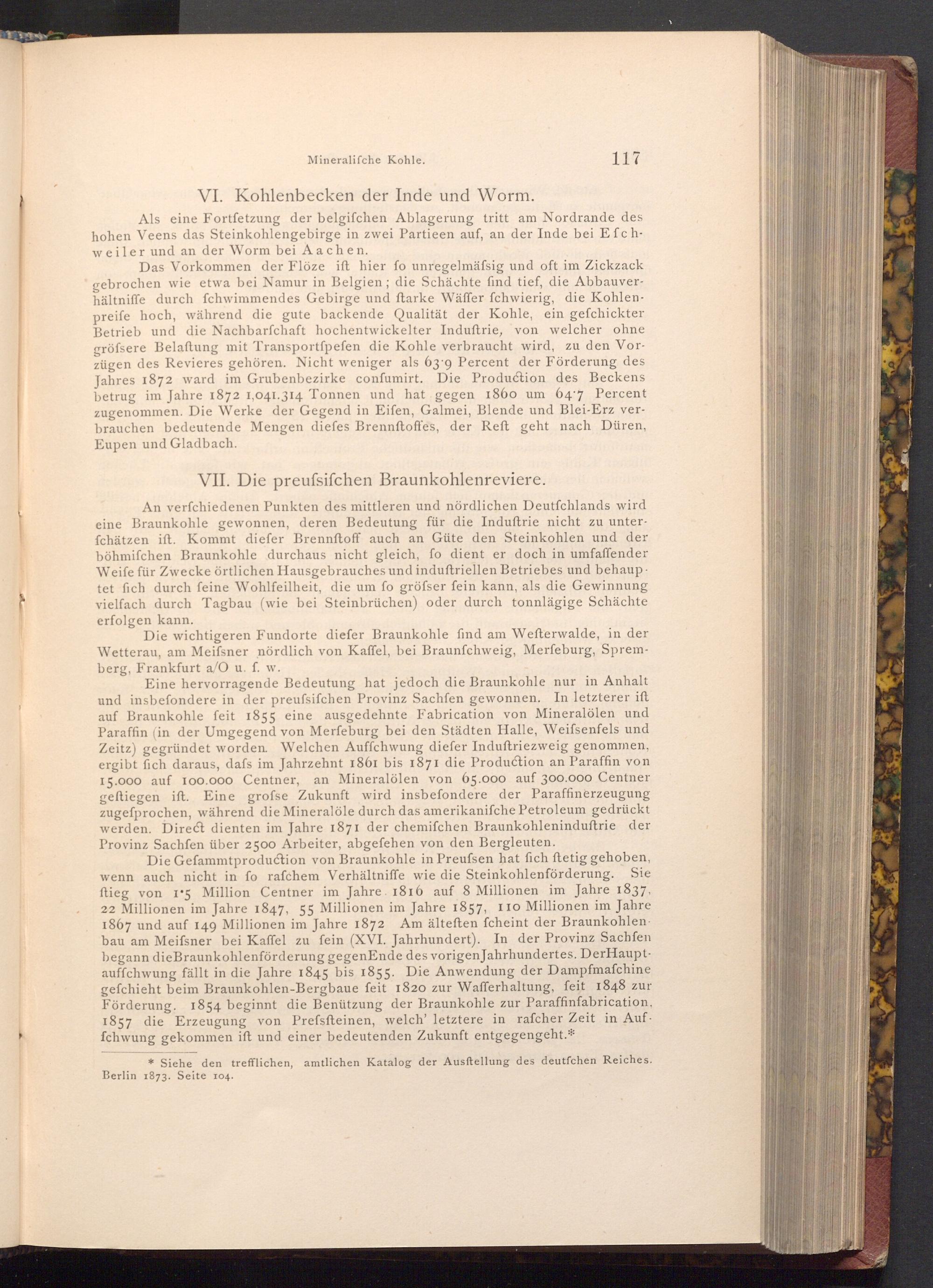 Die Gefammtproduction von Braunkohle in Preufsen hat fich ftetig gehoben, wenn auch nicht in fo rafchem Verhältniffe wie die Steinkohlenförderung. Sie ftieg von 15 Million Centner im Jahre 1816 auf 8 Millionen im Jahre 1837, 22 Millionen im Jahre 1847, 55 Millionen im Jahre 1857, 110 Millionen im Jahre 1867 und auf 149 Millionen im Jahre 1872 Am älteften fcheint der Braunkohlenbau am Meifsner bei Kaffel zu fein( XVI. Jahrhundert). In der Provinz Sachfen begann die Braunkohlenförderung gegen Ende des vorigen Jahrhundertes. DerHauptauffchwung fällt in die Jahre 1845 bis 1855. Die Anwendung der Dampfmaschine gefchieht beim Braunkohlen- Bergbaue feit 1820 zur Wafferhaltung, feit 1848 zur Förderung. 1854 beginnt die Benützung der Braunkohle zur Paraffinfabrication, 1857 die Erzeugung von Prefsfteinen, welch' letztere in rafcher Zeit in Auffchwung gekommen ift und einer bedeutenden Zukunft entgegengeht.*