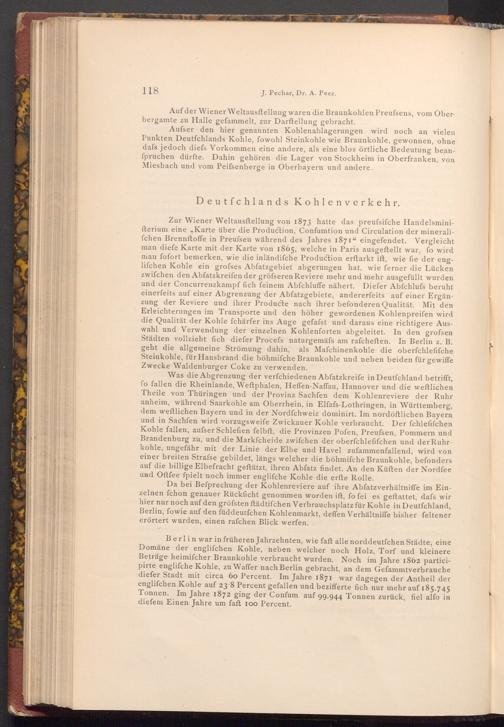 Zur Wiener Weltausftellung von 1873 hatte das preuſsifche Handelsminifterium eine Karte über die Production, Confumtion und Circulation der mineralifchen Brennftoffe in Preufsen während des Jahres 1871" eingefendet. Vergleicht man diefe Karte mit der Karte von 1865, welche in Paris ausgeftellt war, fo wird man fofort bemerken, wie die inländifche Production erftarkt ift, wie fie der englifchen Kohle ein grofses Abfatzgebiet abgerungen hat, wie ferner die Lücken zwifchen den Abfatzkreifen der gröfseren Reviere mehr und mehr ausgefüllt wurden und der Concurrenzkampf fich feinem Abfchluffe nähert. Diefer Abfchlufs beruht einerfeits auf einer Abgrenzung der Abfatzgebiete, andererfeits auf einer Ergänzung der Reviere und ihrer Producte nach ihrer befonderen Qualität. Mit den Erleichterungen im Transporte und den höher gewordenen Kohlenpreifen wird die Qualität der Kohle fchärfer ins Auge gefafst und daraus eine richtigere Auswahl und Verwendung der einzelnen Kohlenforten abgeleitet. In den grofsen Städten vollzieht fich diefer Procefs naturgemäfs am rafcheften. In Berlin z. B. geht die allgemeine Strömung dahin, als Mafchinenkohle die oberfchlefifche Steinkohle, für Hausbrand die böhmifche Braunkohle und neben beiden für gewiffe Zwecke Waldenburger Coke zu verwenden.