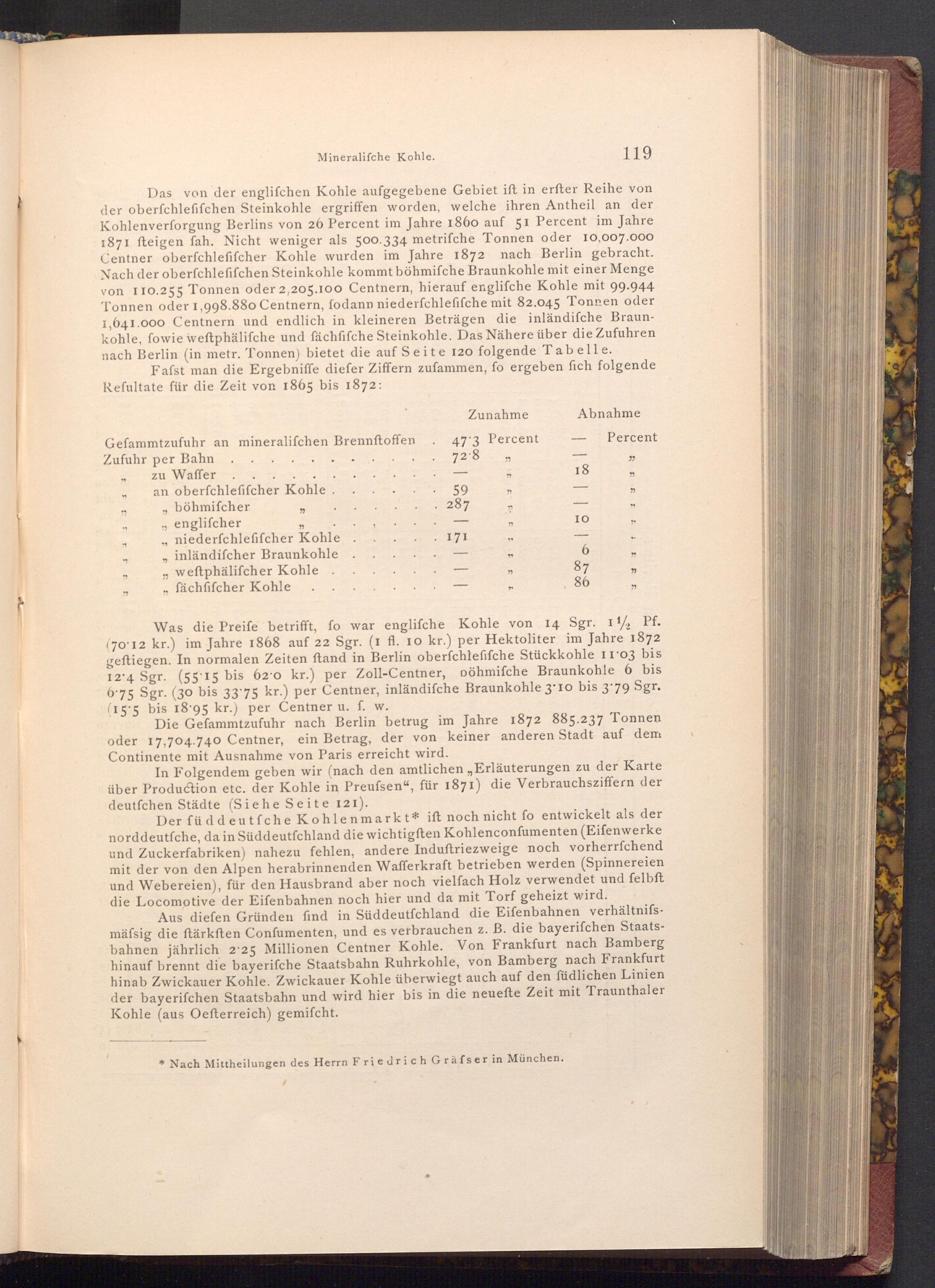 Das von der englifchen Kohle aufgegebene Gebiet ift in erfter Reihe von der oberfchlefifchen Steinkohle ergriffen worden, welche ihren Antheil an der Kohlenverforgung Berlins von 26 Percent im Jahre 1860 auf 51 Percent im Jahre 1871 fteigen fah. Nicht weniger als 500.334 metrifche Tonnen oder 10,007.000 Centner oberfchlefifcher Kohle wurden im Jahre 1872 nach Berlin gebracht. Nach der oberfchlefifchen Steinkohle kommt böhmifche Braunkohle mit einer Menge von 110.255 Tonnen oder 2,205.100 Centnern, hierauf englifche Kohle mit 99.944 Tonnen oder 1,998.880 Centnern, fodann niederfchlefifche mit 82.045 Tonnen oder 1,641.000 Centnern und endlich in kleineren Beträgen die inländifche Braunkohle, fowie weftphälifche und fächfifche Steinkohle. Das Nähere über die Zufuhren nach Berlin( in metr. Tonnen) bietet die auf Seite 120 folgende Tabelle. Fafst man die Ergebniffe diefer Ziffern zufammen, fo ergeben fich folgende Refultate für die Zeit von 1865 bis 1872: