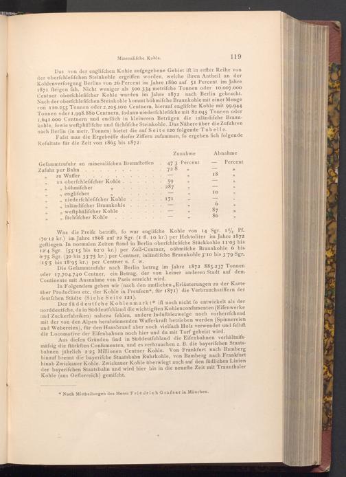 Aus diefen Gründen find in Süddeutſchland die Eifenbahnen verhältnifsmäfsig die ftärksten Confumenten, und es verbrauchen z. B. die bayerifchen Staatsbahnen jährlich 2:25 Millionen Centner Kohle. Von Frankfurt nach Bamberg hinauf brennt die bayerifche Staatsbahn Ruhrkohle, von Bamberg nach Frankfurt hinab Zwickauer Kohle. Zwickauer Kohle überwiegt auch auf den füdlichen Linien der bayerifchen Staatsbahn und wird hier bis in die neuefte Zeit mit Traunthaler Kohle( aus Oefterreich) gemifcht.