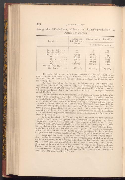 In Folge fortfchreitender Vermehrung der Eifenbahnen und fehr wefentlich gefördert durch eine confequente und nachdrückliche Agitation, als deren Träger wir an erfter Stelle Julius Hirfch, dann den Induftriellen G. Sigl nennen, ift auch in Oefterreich allmälig eine beträchtliche Ermäfsigung der Tarife für die Kohlenverfrachtung eingetreten. Die Südbahn, Nordweftbahn, FranzJofefs- Bahn, die Elifabeth- Weftbahn und auf längere Strecken auch die Staatsbahn verfrachten jetzt die mineralifche Kohle zu Transportfätzen, die fich mindeſtens bei gröfseren Entfernungen dem Einpfennig- Tarife( 0.416 Kreuzer Silber) nähern. Aber auch der Gefetzgebung und Verwaltung der öfterreichifchen Monarchie gebührt die Anerkennung, dafs fie dem Bergbaue eine alljährlich wirkfamer werdende Förderung zu Theil werden liefs. Zwar hat das Berggefetz vom 23. Mai 1854 allerdings neben unzweifelhaften Vorzügen- manche Mängel und Lücken, allein man ift daran, diefelben auf legislatorifchem Wege zu befeitigen. Und auch Ungarn, wo immer noch die alten Berggefetze beſtehen, welche die unterirdifchen Schätze lediglich dem Eigenthümer der Oberfläche zuweifen, bereitet feit dem Jahre 1871 ein neues Berggefetz vor.