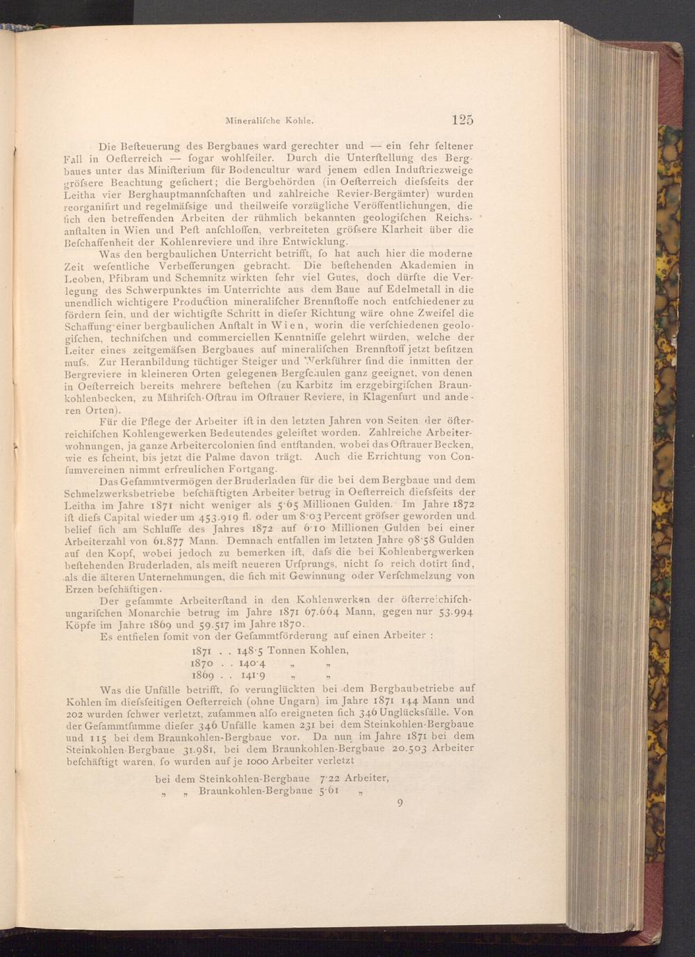 Die Befteuerung des Bergbaues ward gerechter und ein fehr feltener Fall in Oefterreich- fogar wohlfeiler. Durch die Unterftellung des Bergbaues unter das Minifterium für Bodencultur ward jenem edlen Induſtriezweige gröfsere Beachtung gefichert; die Bergbehörden( in Oefterreich diefsfeits der Leitha vier Berghauptmannfchaften und zahlreiche Revier- Bergämter) wurden reorganifirt und regelmässige und theilweife vorzügliche Veröffentlichungen, die fich den betreffenden Arbeiten der rühmlich bekannten geologifchen Reichsanftalten in Wien und Peft anfchloffen, verbreiteten gröfsere Klarheit über die Befchaffenheit der Kohlenreviere und ihre Entwicklung.