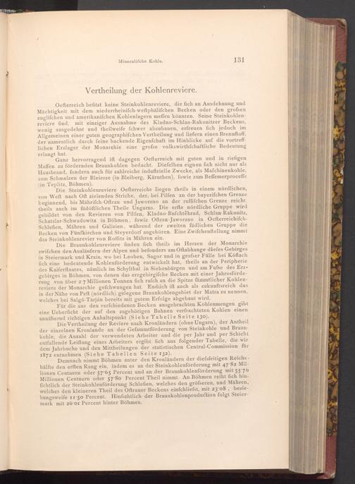 Oefterreich befitzt keine Steinkohlenreviere, die fich an Ausdehnung und Mächtigkeit mit dem niederrheinifch- weftphälifchen Becken oder den grofsen englifchen und amerikaniſchen Kohlenlagern meffen könnten. Seine Steinkohlenreviere find, mit einziger Ausnahme des Kladno- Schlan- Rakonitzer Beckens, wenig ausgedehnt und theilweife fchwer abzubauen, erfreuen fich jedoch im Allgemeinen einer guten geographifchen Vertheilung und liefern einen Brennftoff, der namentlich durch feine backende Eigenfchaft im Hinblicke auf die vortreff. lichen Erzlager der Monarchie eine grofse volkswirthschaftliche Bedeutung erlangt hat.