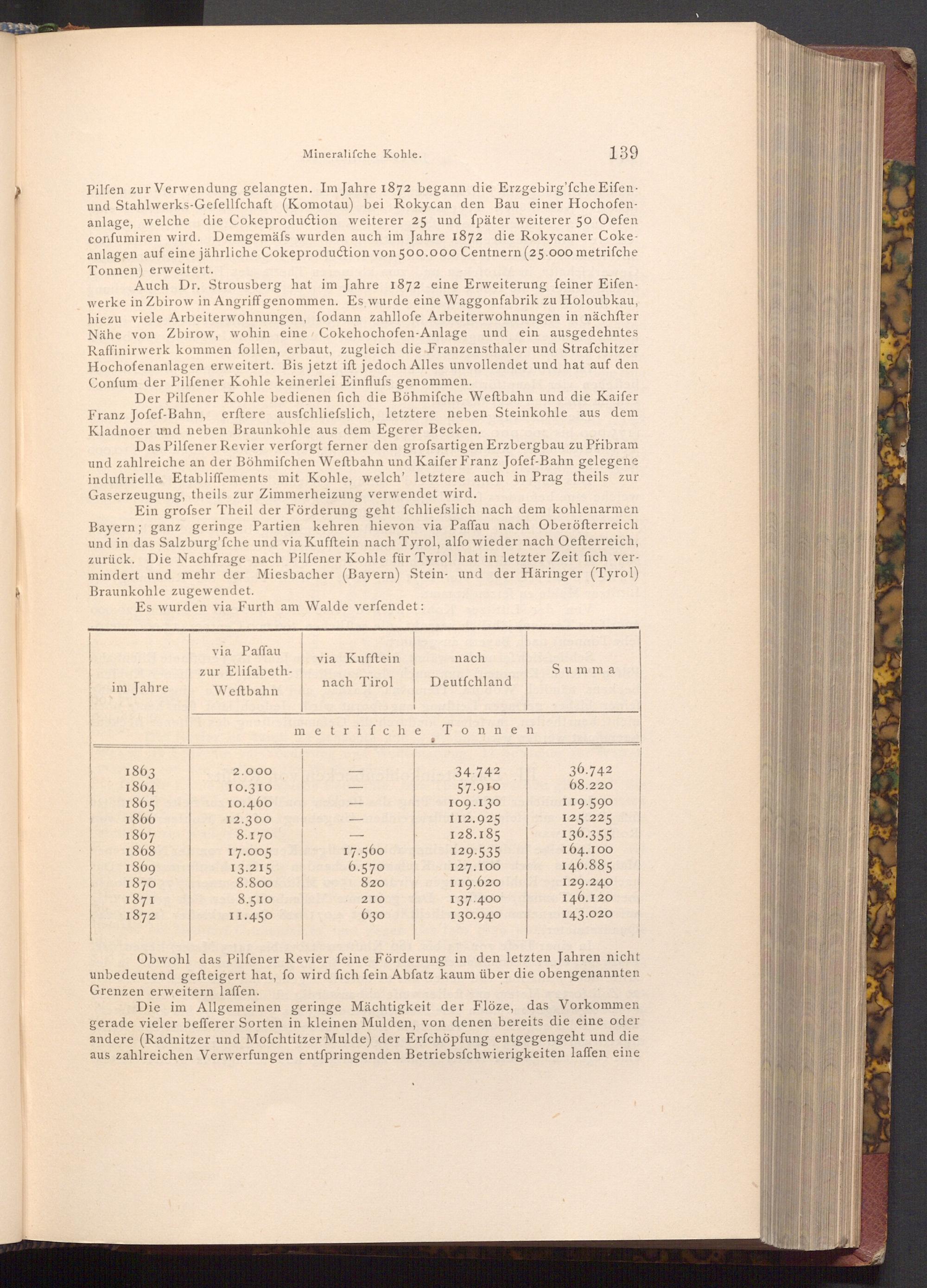 Ein grofser Theil der Förderung geht fchliefslich nach dem kohlenarmen Bayern; ganz geringe Partien kehren hievon via Paffau nach Oberösterreich und in das Salzburg'fche und via Kufftein nach Tyrol, alfo wieder nach Oefterreich, zurück. Die Nachfrage nach Pilfener Kohle für Tyrol hat in letzter Zeit fich vermindert und mehr der Miesbacher( Bayern) Stein- und der Häringer( Tyrol) Braunkohle zugewendet.