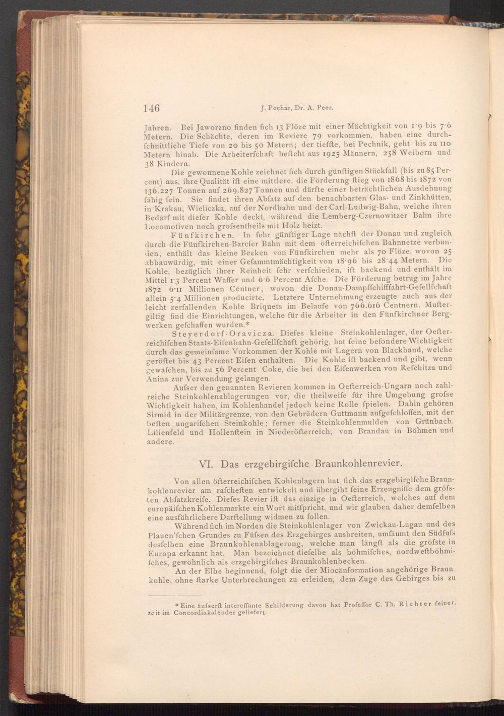 Fünfkirchen. In fehr günftiger Lage nächft der Donau und zugleich durch die Fünfkirchen- Barcfer Bahn mit dem öfterreichifchen Bahnnetze verbunden, enthält das kleine Becken von Fünfkirchen mehr als 70 Flöze, wovon 25 Die abbauwürdig, mit einer Gefammtmächtigkeit von 18.96 bis 28 44 Metern. Kohle, bezüglich ihrer Reinheit fehr verfchieden, ift backend und enthält im Mittel 13 Percent Waffer und 6.6 Percent Afche. Die Förderung betrug im Jahre 1872 6.11 Millionen Centner, wovon die Donau- Dampffchifffahrt- Gefellſchaft allein 5.4 Millionen producirte. Letztere Unternehmung erzeugte auch aus der leicht zerfallenden Kohle Briquets im Belaufe von 766.616 Centnern. Muftergiltig find die Einrichtungen, welche für die Arbeiter in den Fünfkirchner Bergwerken gefchaffen wurden.*
