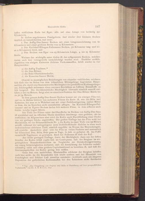 Obwohl in mannigfachen Beziehungen von einander verfchieden, zeichnen fich diefe vier im Süden von dem böhmifchen Mittelgebirge begrenzten Hauptmulden alle durch eine ftaunenswerthe Mächtigkeit des productiven Kohlengebirges aus, folchergeftalt zufammen einen enormen Reichthum an foffilem Brennftoffe in fich bergend. Die durchſchnittliche Mächtigkeit fchwankt nämlich zumeift zwifchen 7 und 19 Metern, fteigt aber an einzelnen Punkten der Dux- Biliner Mulde bis zu 30 34 Metern.