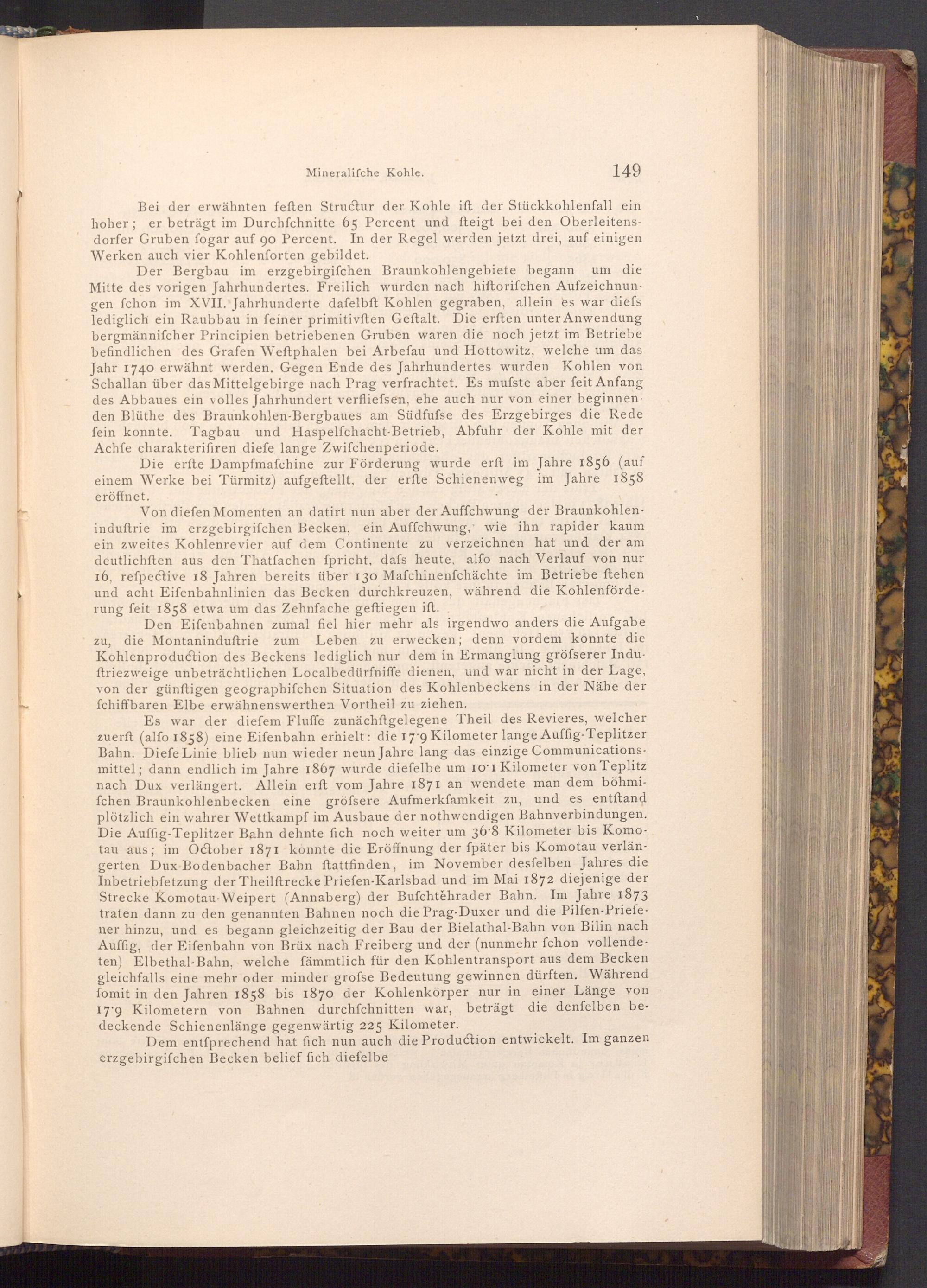 Von diefen Momenten an datirt nun aber der Auffchwung der Braunkohleninduftrie im erzgebirgifchen Becken, ein Auffchwung, wie ihn rapider kaum ein zweites Kohlenrevier auf dem Continente zu verzeichnen hat und der am deutlichften aus den Thatfachen ſpricht, dafs heute, alfo nach Verlauf von nur 16, refpective 18 Jahren bereits über 130 Mafchinenfchächte im Betriebe ftehen. und acht Eifenbahnlinien das Becken durchkreuzen, während die Kohlenförderung feit 1858 etwa um das Zehnfache geftiegen ift.