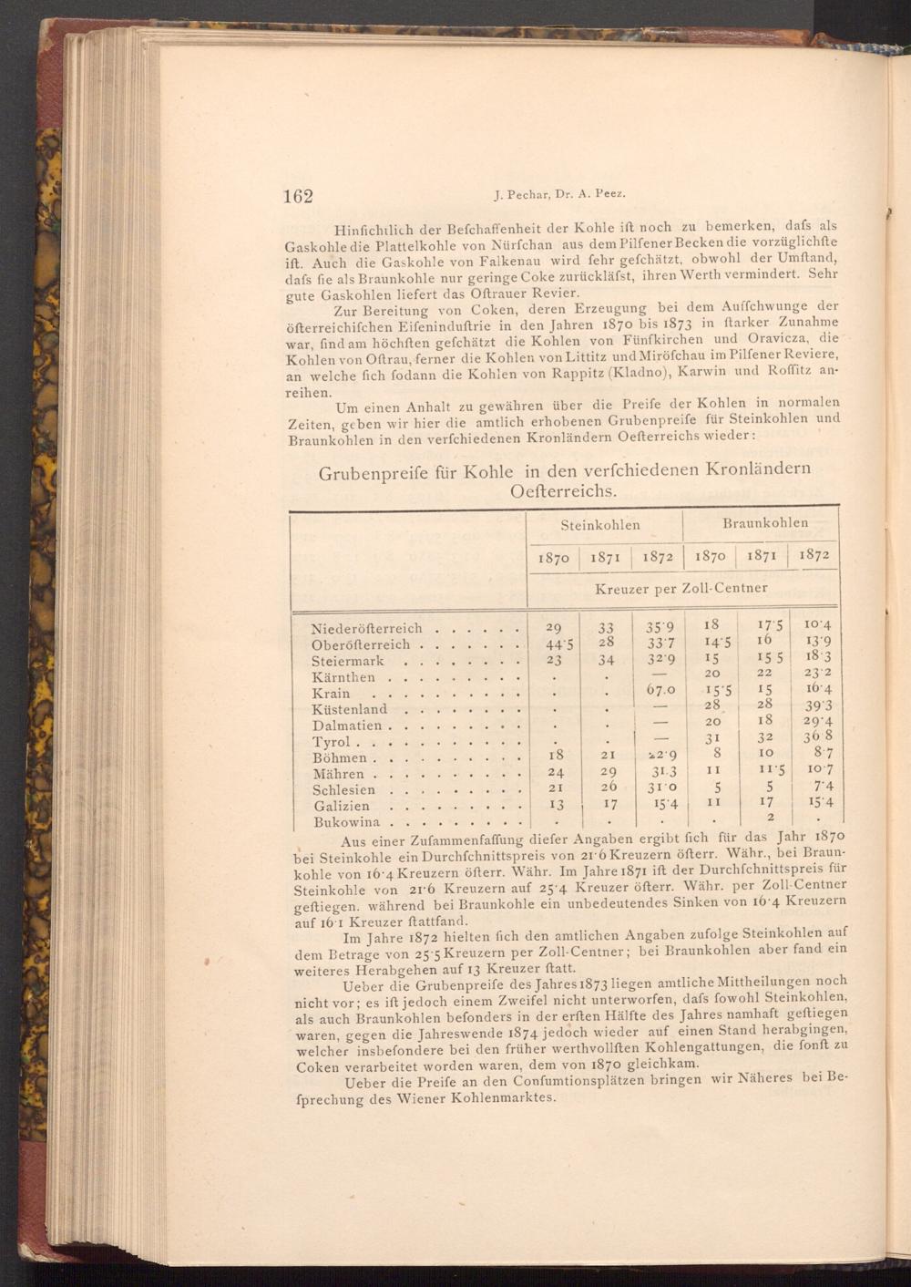 Ueber die Grubenpreife des Jahres 1873 liegen amtliche Mittheilungen noch nicht vor; es ift jedoch einem Zweifel nicht unterworfen, dafs fowohl Steinkohlen, als auch Braunkohlen befonders in der erften Hälfte des Jahres namhaft geftiegen waren, gegen die Jahreswende 1874 jedoch wieder auf einen Stand herabgingen, welcher insbefondere bei den früher werthvollften Kohlengattungen, die fonft zu Coken verarbeitet worden waren, dem von 1870 gleichkam.