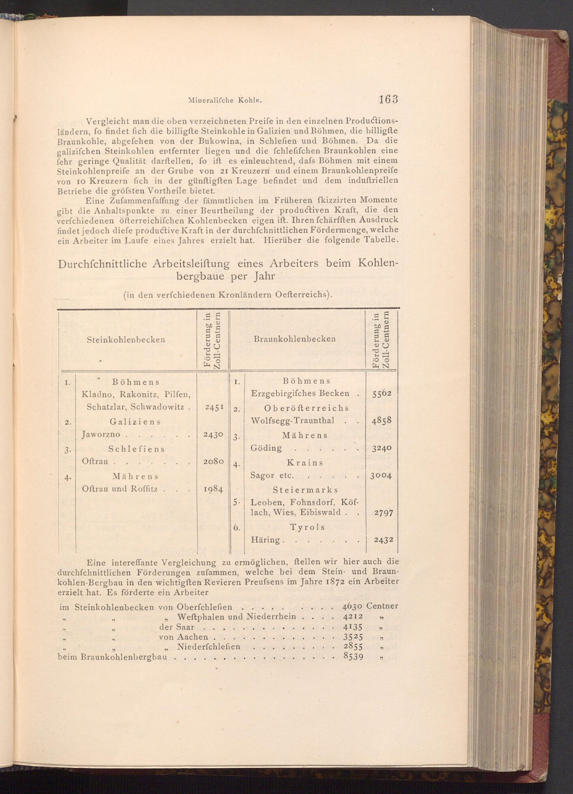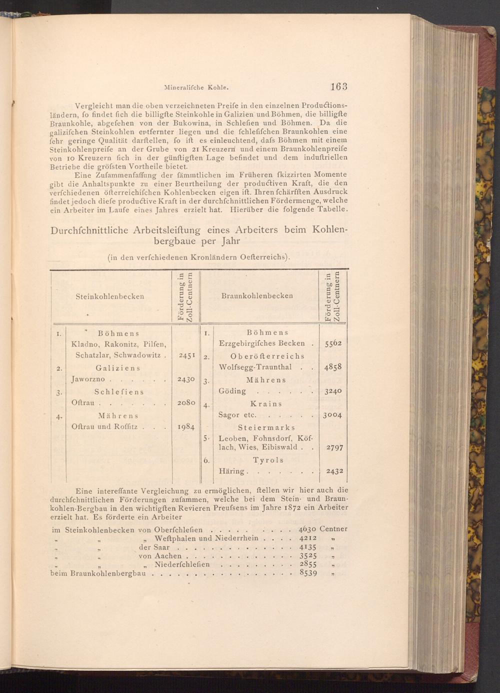 Vergleicht man die oben verzeichneten Preife in den einzelnen Productionsländern, fo findet fich die billigfte Steinkohle in Galizien und Böhmen, die billigfte Braunkohle, abgefehen von der Bukowina, in Schlefien und Böhmen. Da die galizifchen Steinkohlen entfernter liegen und die fchlefifchen Braunkohlen eine fehr geringe Qualität darftellen, fo ift es einleuchtend, dafs Böhmen mit einem Steinkohlenpreife an der Grube von 21 Kreuzern und einem Braunkohlenpreife von 10 Kreuzern fich in der günftigften Lage befindet und dem induftriellen Betriebe die gröfsten Vortheile bietet.