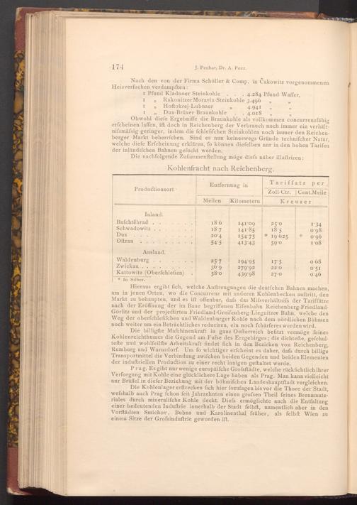 Obwohl diefe Ergebniffe die Braunkohle als vollkommen concurrenzfähig erfcheinen laffen, ift doch in Reichenberg der Verbrauch noch immer ein verhältnifsmäfsig geringer, indem die fchlefifchen Steinkohlen noch immer den Reichenberger Markt beherrschen. Sind es nun keineswegs Gründe technifcher Natur, welche diefe Erfcheinung erklären, fo können diefelben nur in den hohen Tarifen der inländifchen Bahnen gefucht werden.