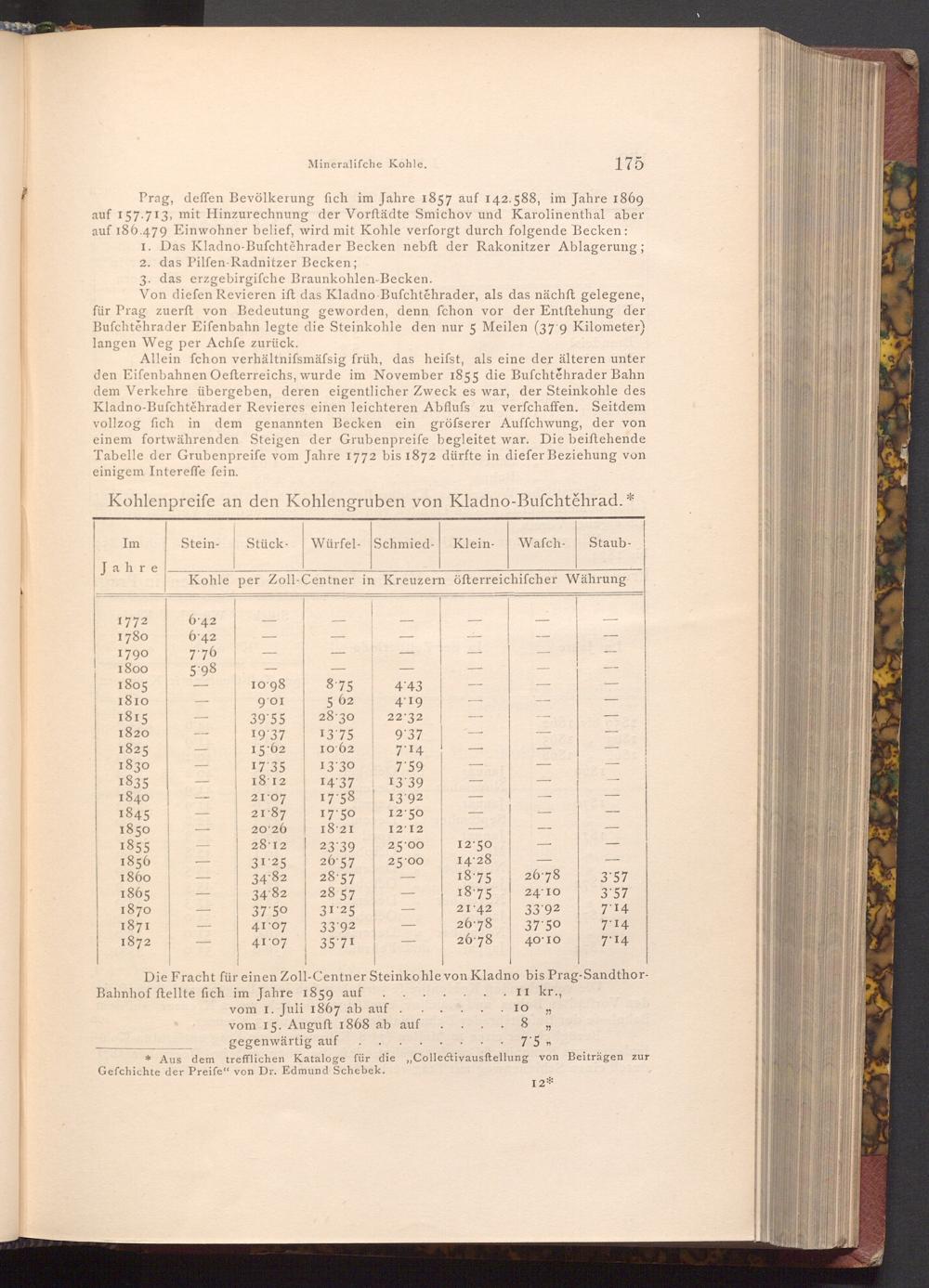 Allein fchon verhältnifsmäfsig früh, das heifst, als eine der älteren unter den Eifenbahnen Oefterreichs, wurde im November 1855 die Bufchtěhrader Bahn dem Verkehre übergeben, deren eigentlicher Zweck es war, der Steinkohle des Kladno- Bufchtěhrader Revieres einen leichteren Abflufs zu verfchaffen. Seitdem vollzog fich in dem genannten Becken ein gröfserer Auffchwung, der von einem fortwährenden Steigen der Grubenpreife begleitet war. Die beiftehende Tabelle der Grubenpreife vom Jahre 1772 bis 1872 dürfte in diefer Beziehung von einigem Intereffe fein.