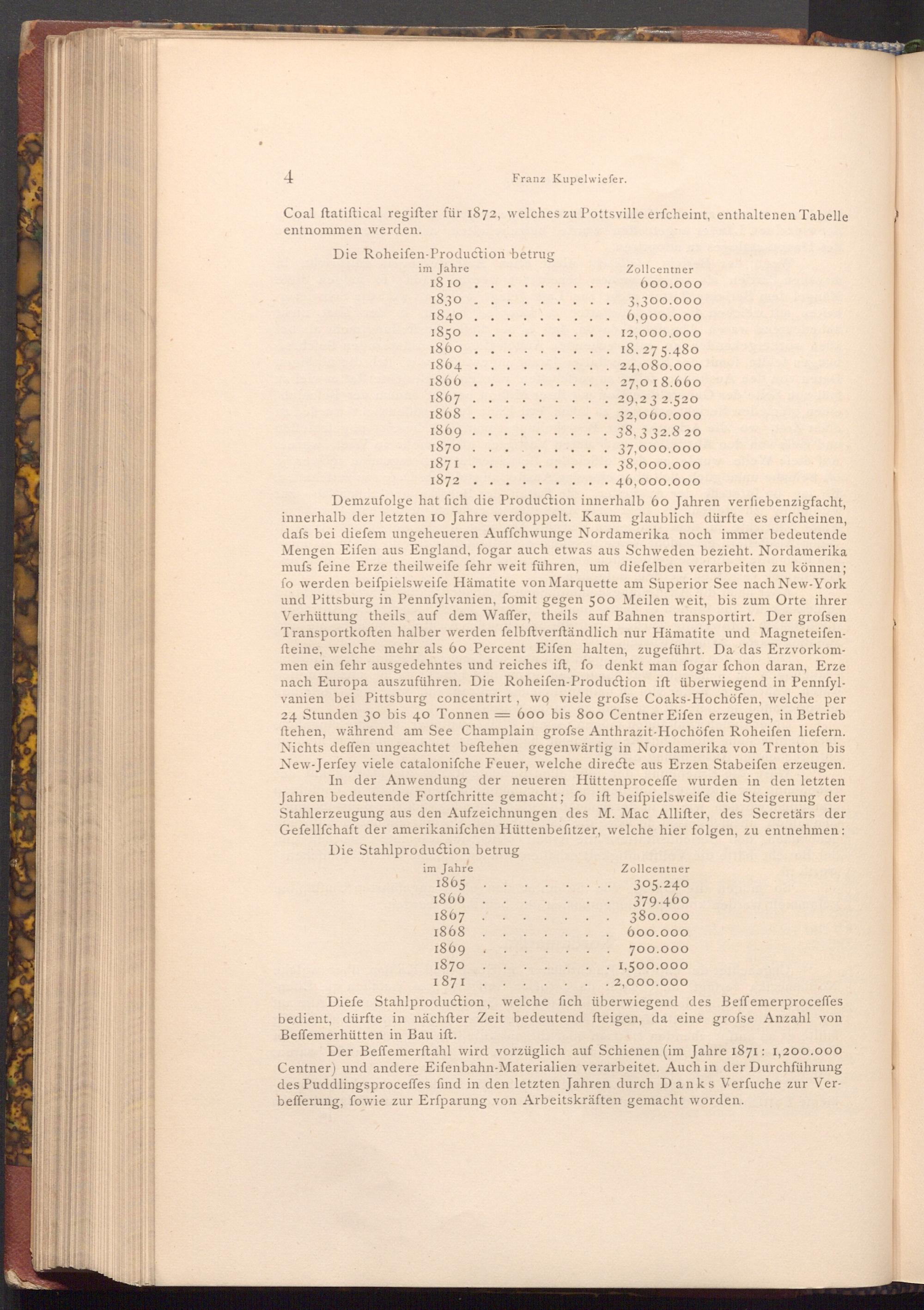 In der Anwendung der neueren Hüttenproceffe wurden in den letzten Jahren bedeutende Fortfchritte gemacht; fo ift beiſpielsweife die Steigerung der Stahlerzeugung aus den Aufzeichnungen des M. Mac Allifter, des Secretärs der Gefellſchaft der amerikaniſchen Hüttenbefitzer, welche hier folgen, zu entnehmen: Die Stahlproduction betrug