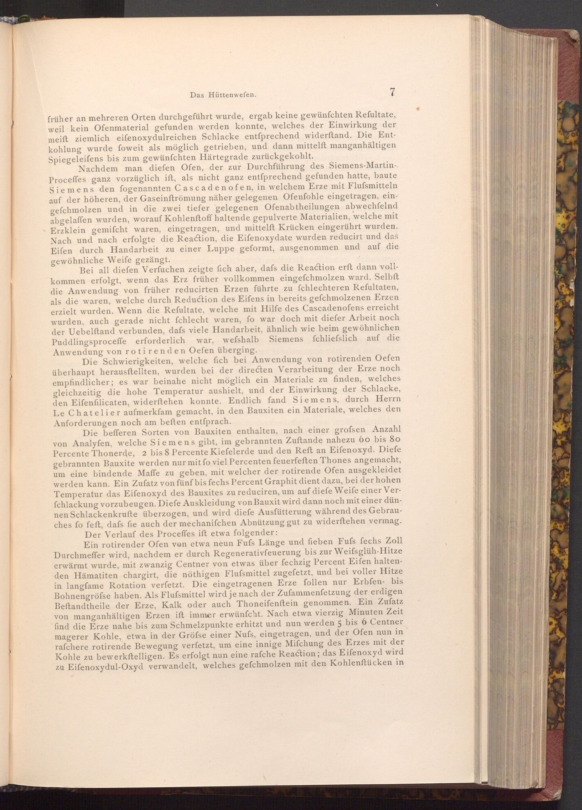 Bei all diefen Verfuchen zeigte fich aber, dafs die Reaction erft dann vollkommen erfolgt, wenn das Erz früher vollkommen eingefchmolzen ward. Selbft die Anwendung von früher reducirten Erzen führte zu fchlechteren Refultaten, als die waren, welche durch Reduction des Eifens in bereits gefchmolzenen Erzen. erzielt wurden. Wenn die Refultate, welche mit Hilfe des Cascadenofens erreicht wurden, auch gerade nicht fchlecht waren, fo war doch mit diefer Arbeit noch der Uebelftand verbunden, dafs viele Handarbeit, ähnlich wie beim gewöhnlichen Puddlingsproceffe erforderlich war, wefshalb Siemens fchliefslich auf die Anwendung von rotirenden Oefen überging.