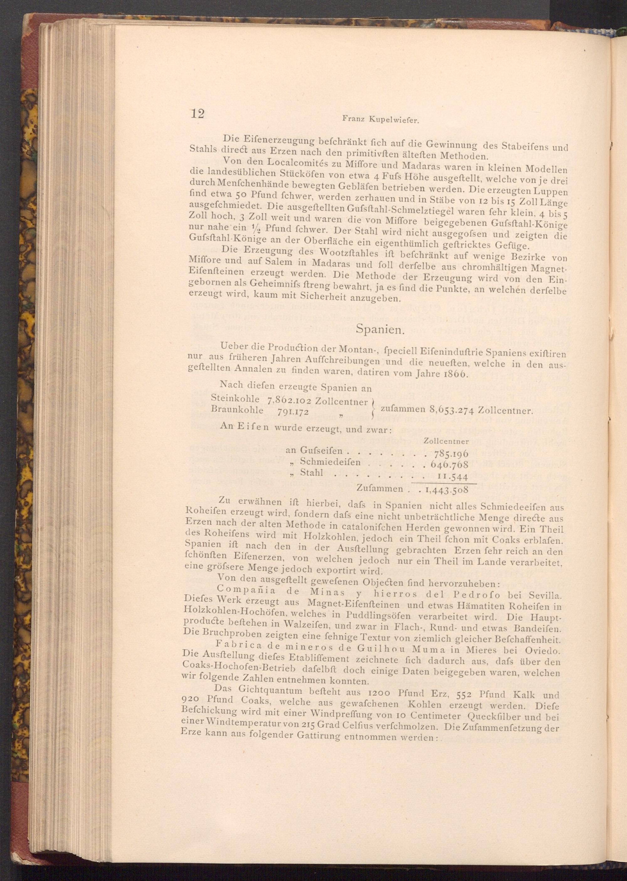 Compañia de Minas y hierros del Pedrofo bei Sevilla. Diefes Werk erzeugt aus Magnet- Eifenfteinen und etwas Hämatiten Roheifen in Holzkohlen- Hochöfen, welches in Puddlingsöfen verarbeitet wird. Die Hauptproducte beftehen in Walzeifen, und zwar in Flach-, Rund- und etwas Bandeifen. Die Bruchproben zeigten eine fehnige Textur von ziemlich gleicher Befchaffenheit. Fabrica de mineros de Guilhou Muma in Mieres bei Oviedo. Die Ausftellung diefes Etabliffement zeichnete fich dadurch aus, dafs über den Coaks- Hochofen- Betrieb dafelbft doch einige Daten beigegeben waren, welchen wir folgende Zahlen entnehmen konnten.