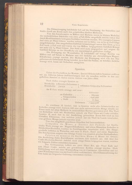 Ueber die Production der Montan-, fpeciell Eifeninduftrie Spaniens exiftiren nur aus früheren Jahren Auffchreibungen und die neueften, welche in den ausgeftellten Annalen zu finden waren, datiren vom Jahre 1866.