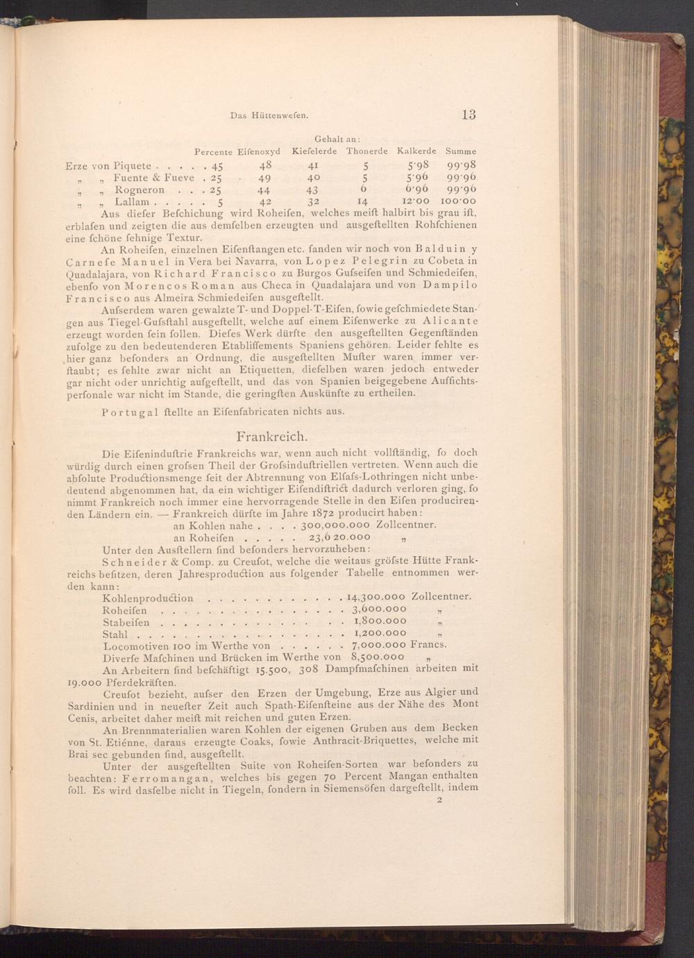 Unter den Ausftellern find befonders hervorzuheben: Schneider& Comp. zu Creufot, welche die weitaus gröfste Hütte Frankreichs befitzen, deren Jahresproduction aus folgender Tabelle entnommen den kann: