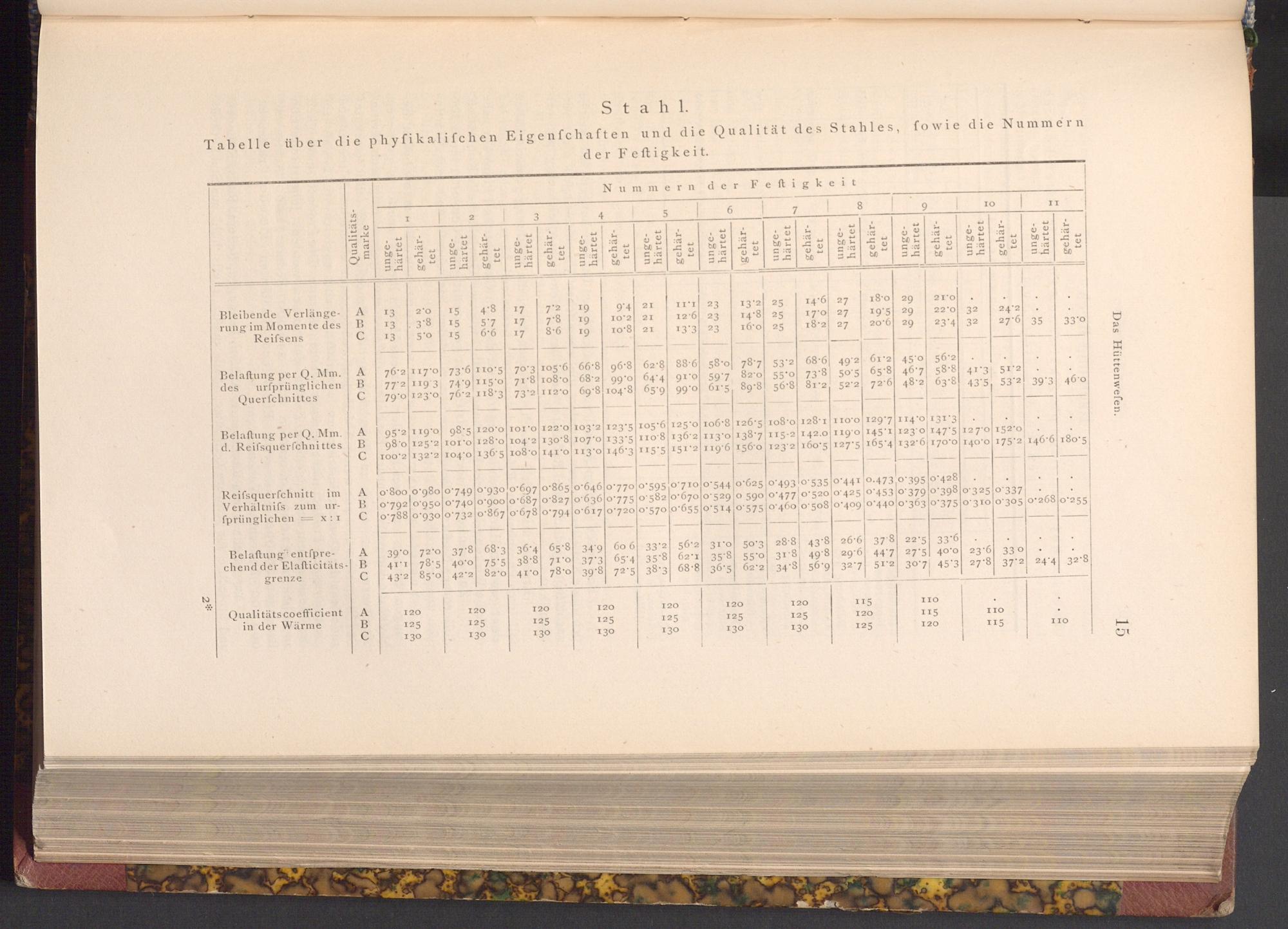 Tabelle über die phyfikalifchen Eigenfchaften und die Qualität des Stahles, fowie die Nummern der Feftigkeit.