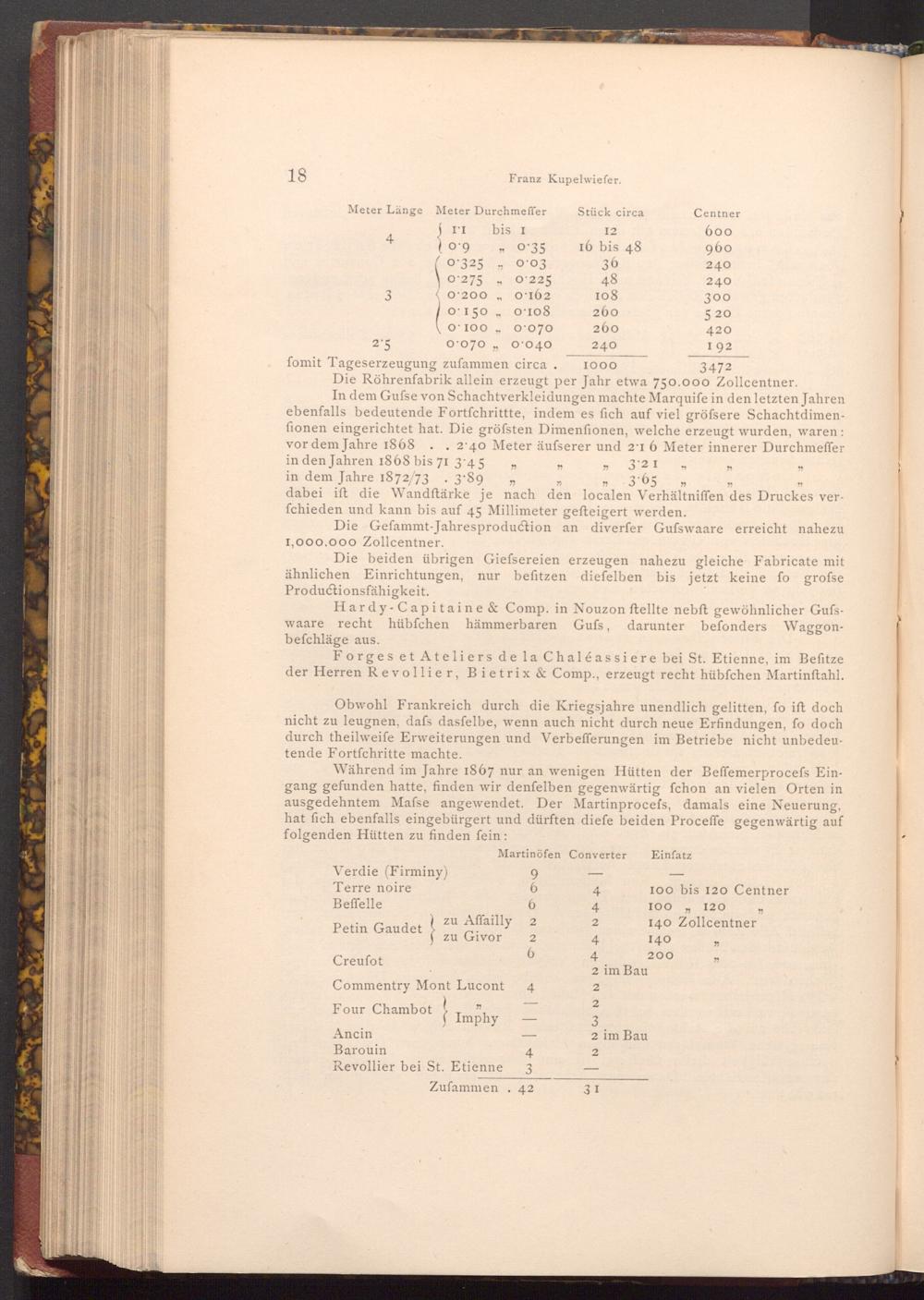 Während im Jahre 1867 nur an wenigen Hütten der Beffemerprocefs Eingang gefunden hatte, finden wir denfelben gegenwärtig fchon an vielen Orten in ausgedehntem Mafse angewendet. Der Martinprocefs, damals eine Neuerung, hat fich ebenfalls eingebürgert und dürften diefe beiden Proceffe gegenwärtig auf folgenden Hütten zu finden fein: