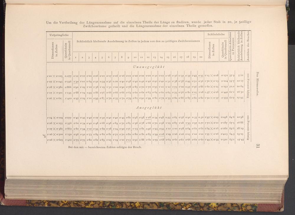 Um die Vertheilung der Längenzunahme auf die einzelnen Theile der Länge zu ftudiren, wurde jeder Stab in 20, je 5zöllige Zwifchenräume getheilt und die Längenzunahme der einzelnen Theile gemeffen.