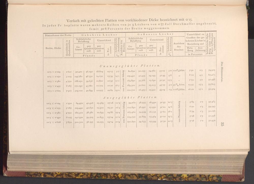In jeder Pr beplatte waren mehrere Reihen von je 5 Löchern von o 77 Zoll Durchmeffer angebracht, fomit 30 8 Percente der Breite weggenommen.
