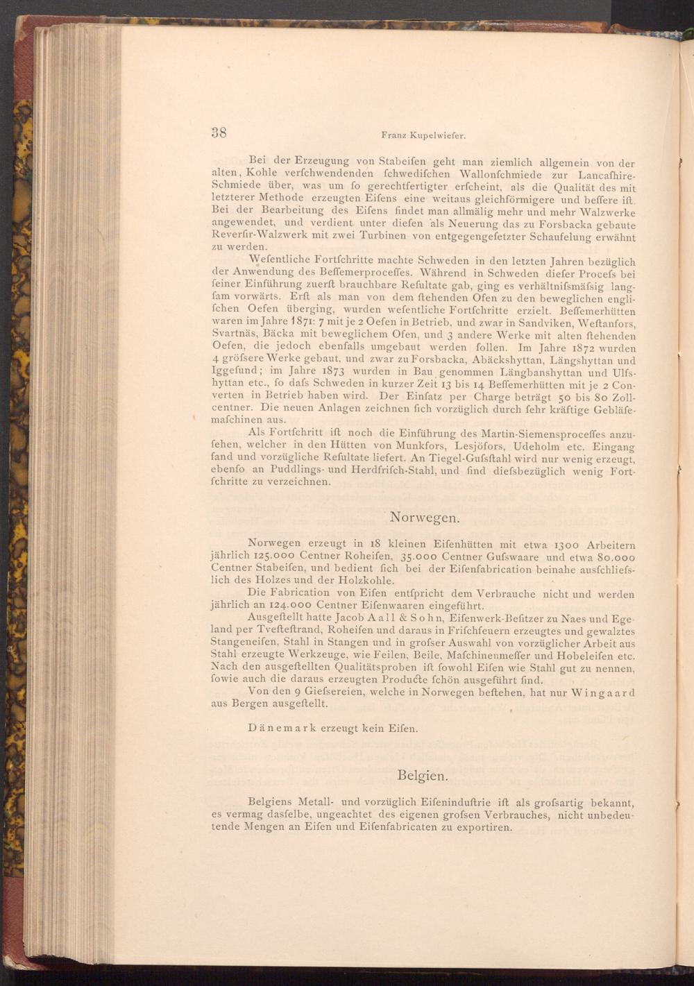 Als Fortfchritt ift noch die Einführung des Martin- Siemensproceffes anzufehen, welcher in den Hütten von Munkfors, Lesjöfors, Udeholm etc. Eingang fand und vorzügliche Refultate liefert. An Tiegel- Gufsftahl wird nur wenig erzeugt, ebenfo an Puddlings- und Herdfrifch- Stahl, und find diefsbezüglich wenig Fortfchritte zu verzeichnen.