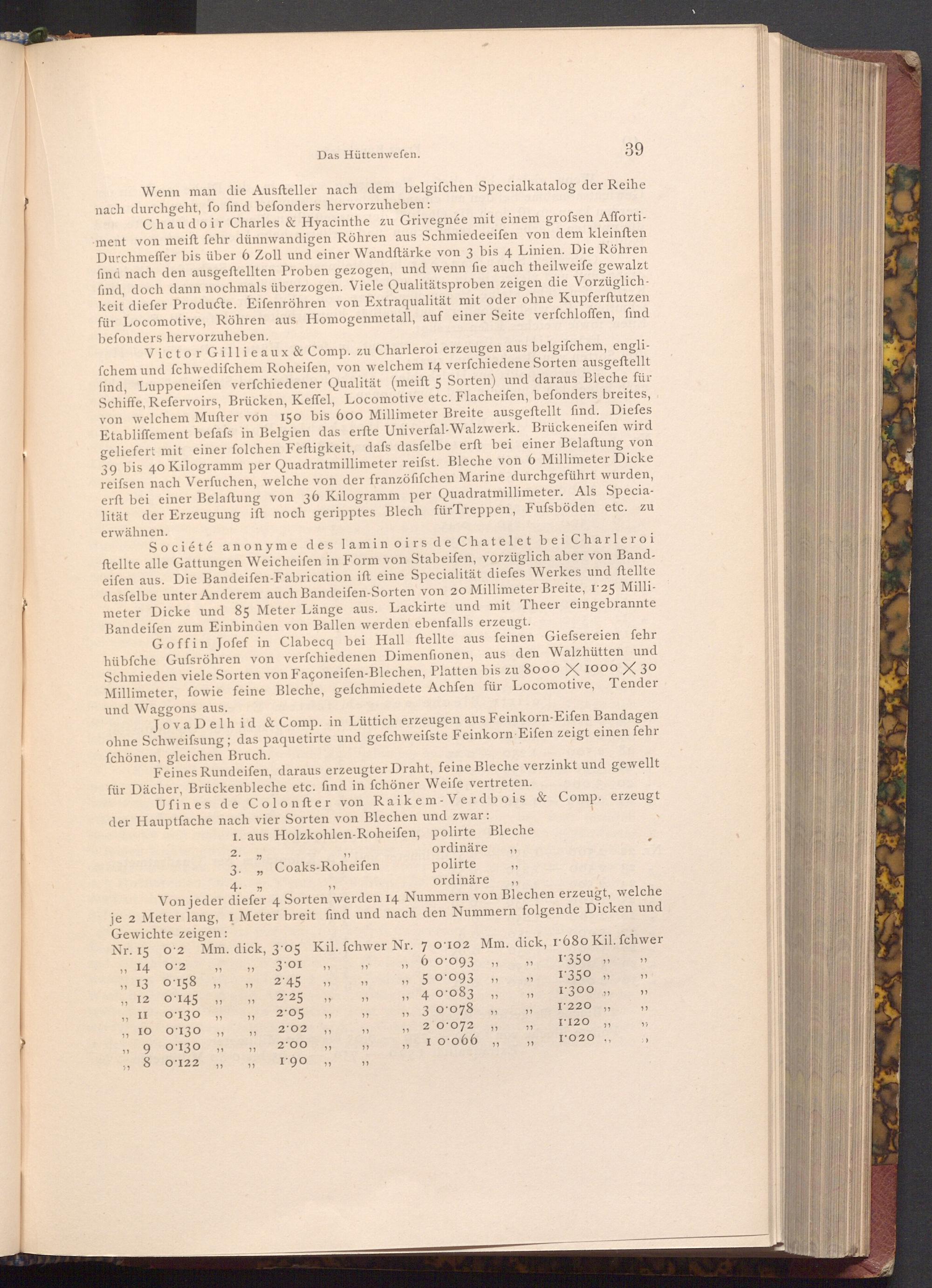 Société anonyme des lamin oirs de Chatelet bei Charleroi ftellte alle Gattungen Weicheifen in Form von Stabeifen, vorzüglich aber von Bandeifen aus. Die Bandeifen- Fabrication ift eine Specialität diefes Werkes und ftellte dasfelbe unter Anderem auch Bandeifen- Sorten von 20 Millimeter Breite, 1'25 Millimeter Dicke und 85 Meter Länge aus. Lackirte und mit Theer eingebrannte Bandeifen zum Einbinden von Ballen werden ebenfalls erzeugt.