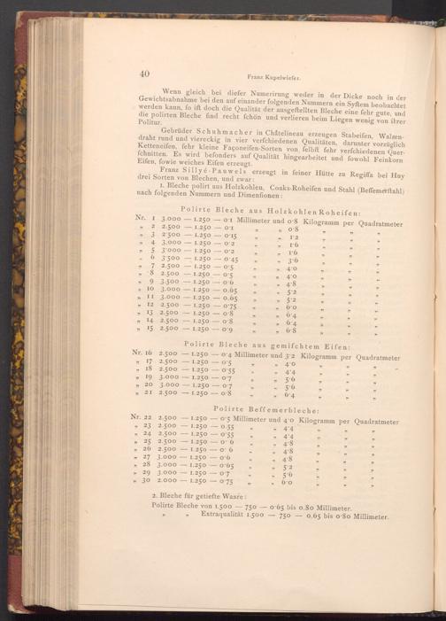 Wenn gleich bei diefer Numerirung weder in der Dicke noch in der Gewichtsabnahme bei den auf einander folgenden Nummern ein Syftem beobachtet werden kann, fo ift doch die Qualität der ausgeftellten Bleche eine fehr gute, und die polirten Bleche find recht fchön und verlieren beim Liegen wenig von ihrer Politur.