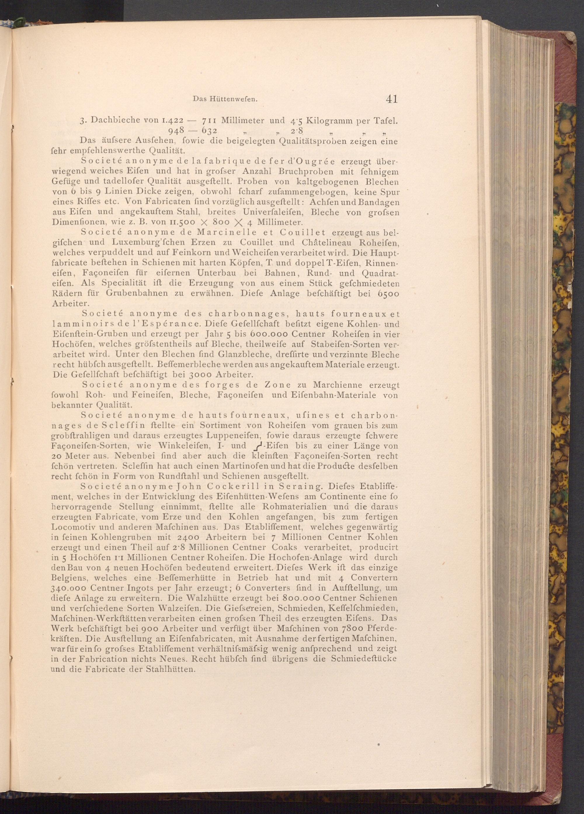 Societé anonyme de la fabrique de fer d'Ougrée erzeugt überwiegend weiches Eifen und hat in grofser Anzahl Bruchproben mit fehnigem Gefüge und tadellofer Qualität ausgeftellt. Proben von kaltgebogenen Blechen von 6 bis 9 Linien Dicke zeigen, obwohl fcharf zufammengebogen, keine Spur eines Riffes etc. Von Fabricaten find vorzüglich ausgeftellt: Achfen und Bandagen aus Eifen und angekauftem Stahl, breites Univerfaleifen, Bleche von grofsen Dimenfionen, wie z. B. von II.500 X 800 X 4 Millimeter.