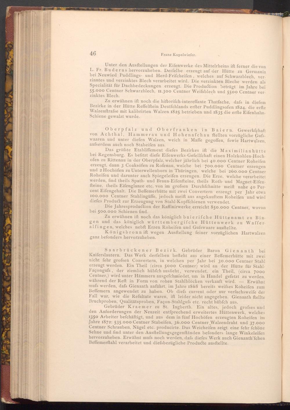 Das gröfste Etabliffement diefes Bezirkes ift die Maximilianhütte bei Regensburg. Es befitzt diefe Eifenwerks- Gefellfchaft einen Holzkohlen- Hochofen zu Rittenau in der Oberpfalz, welcher jährlich bei 40.000 Centner Roheifen erzeugt, dann 3 Coaksöfen zu Rofenau, welche bei 700.000 Centner erzeugen und 2 Hochöfen zu Unterwellenborn in Thüringen, welche bei 260.000 Centner Roheifen und darunter auch Spiegeleifen erzeugen. Die Erze, welche verarbeitet werden, find theils Spath- und Braun- Eifenfteine, theils Roth- und Magnet- Eifenfteine, theils Eifenglanze etc. von im grofsen Durchfchnitte meift nahe 40 Percent Eifengehalt. Die Beffemerhütte mit zwei Convertern erzeugt per Jahr etwa 100.000 Centner Stahlingüffe, jedoch meift aus angekauftem Roheifen und wird diefes Product zur Erzeugung von Stahl- Kopffchienen verwendet.