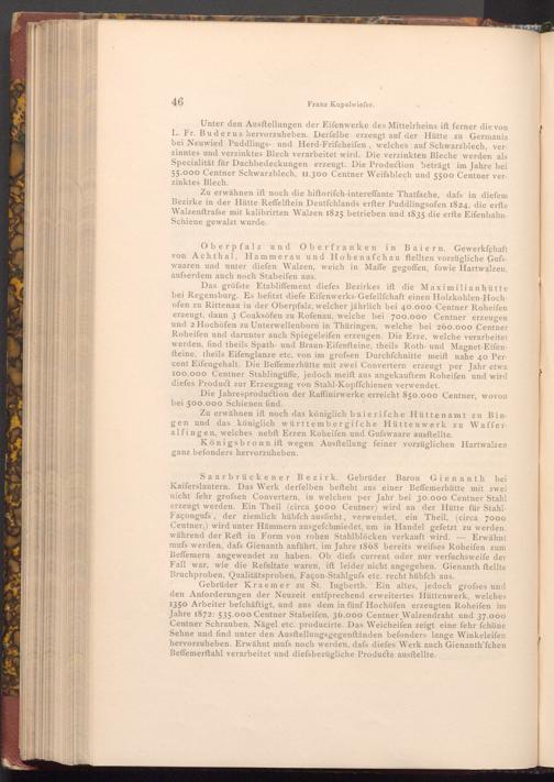 Gebrüder Kraemer zu St. Ingberth. Ein altes, jedoch grofses und den Anforderungen der Neuzeit entſprechend erweitertes Hüttenwerk, welches 1350 Arbeiter befchäftigt, und aus dem in fünf Hochöfen erzeugten Roheifen im Jahre 1872: 535.000 Centner Stabeifen, 36.000 Centner Walzendraht und 37.000 Centner Schrauben, Nägel etc. producirte. Das Weicheifen zeigt eine fehr ſchöne Sehne und find unter den Ausftellungsgegenständen befonders lange Winkeleifen hervorzuheben. Erwähnt mufs noch werden, dafs diefes Werk auch Gienanth'fchen Beffemerftahl verarbeitet und diefsbezügliche Producte ausftellte.