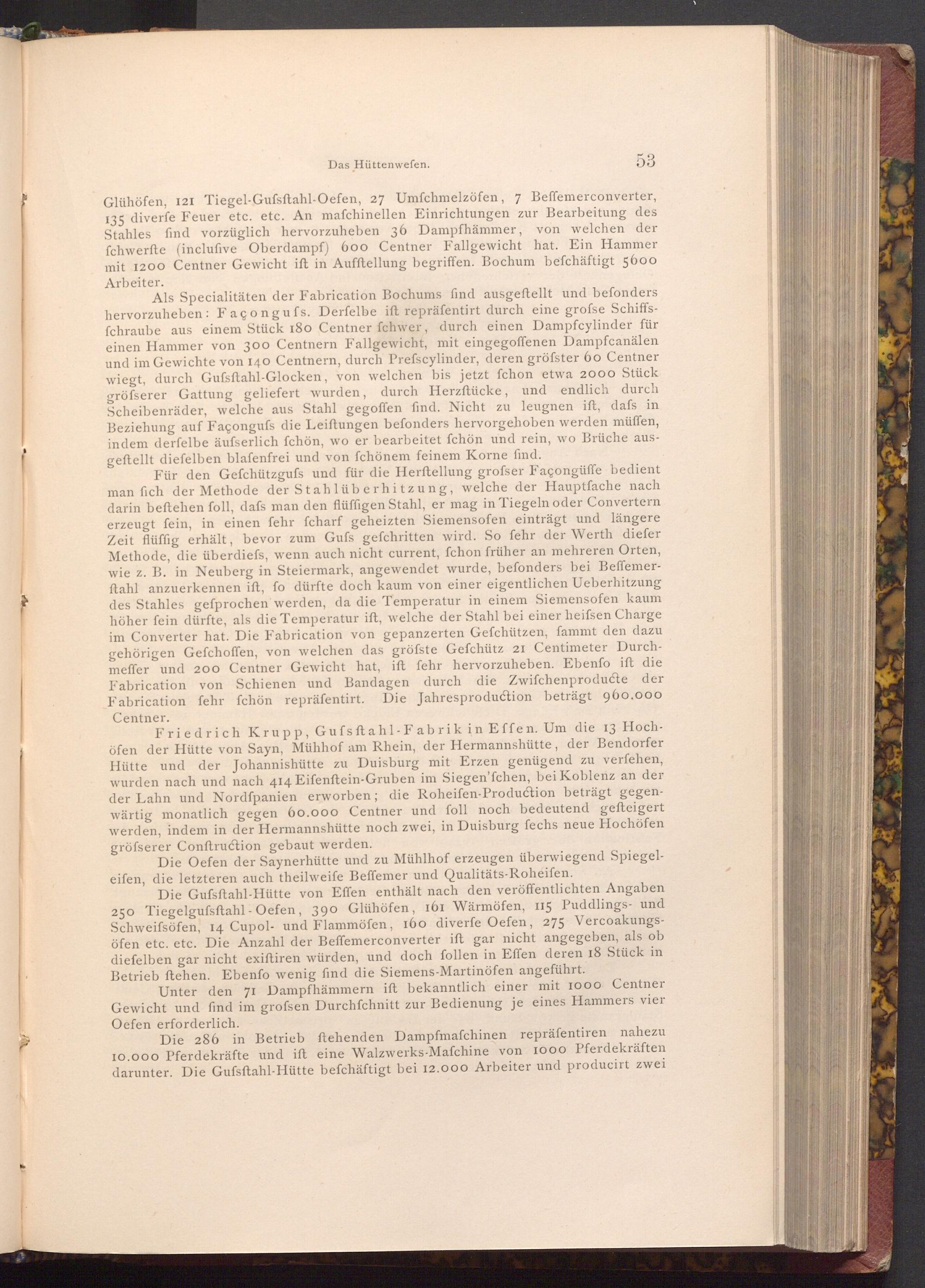 Als Specialitäten der Fabrication Bochums find ausgeftellt und befonders hervorzuheben: Façongufs. Derfelbe ift repräfentirt durch eine grofse Schiffsfchraube aus einem Stück 180 Centner fchwer, durch einen Dampfcylinder für einen Hammer von 300 Centnern Fallgewicht, mit eingegoffenen Dampfcanälen und im Gewichte von 140 Centnern, durch Prefscylinder, deren gröfster 60 Centner wiegt, durch Gufsftahl- Glocken, von welchen bis jetzt fchon etwa 2000 Stück gröfserer Gattung geliefert wurden, durch Herzftücke, und endlich durch Scheibenräder, welche aus Stahl gegoffen find. Nicht zu leugnen ift, dafs in Beziehung auf Façongufs die Leiftungen befonders hervorgehoben werden müffen, indem derfelbe äufserlich fchön, wo er bearbeitet fchön und rein, wo Brüche ausgeftellt diefelben blafenfrei und von fchönem feinem Korne find.