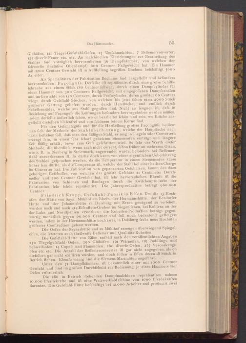 Friedrich Krupp, Gufsftahl- Fabrik in Effen. Um die 13 Hochöfen der Hütte von Sayn, Mühhof am Rhein, der Hermannshütte, der Bendorfer Hütte und der Johannishütte zu Duisburg mit Erzen genügend zu verfehen, wurden nach und nach 414 Eifenftein- Gruben im Siegen'fchen, bei Koblenz an der der Lahn und Nordfpanien erworben; die Roheifen- Production beträgt gegenwärtig monatlich gegen 60.000 Centner und foll noch bedeutend gefteigert werden, indem in der Hermannshütte noch zwei, in Duisburg fechs neue Hochöfen gröfserer Conftruction gebaut werden.