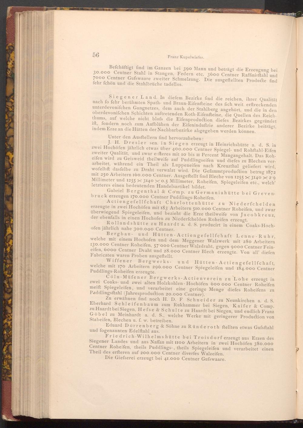 J. H. Dresler sen. in Siegen erzeugt in Heinrichshütte a. d. S. in zwei Hochöfen jährlich etwas über 400.000 Centner Spiegel- und Rohftahl- Eifen zweiter Qualität, und zwar eifteres mit 10 bis II Percent Mangangehalt. Das Roheifen wird zu Geisweid theilweife auf Puddlingseifen und diefes zu Blechen verarbeitet, während ein Theil als Luppeneifen nach Kreuzthal geliefert wird, wofelbft dasfelbe zu Draht verwalzt wird. Die Gefammtproduction betrug 1872 mit 250 Arbeitern 160.000 Centner. Ausgeftellt find Bleche von 1255 X 3140 x 2.9 Millimeter und 1255 x 3140 X 0.5 Millimeter, Roheifen, Spiegeleifen etc., welch' letzteres einen bedeutenden Handelsartikel bildet.